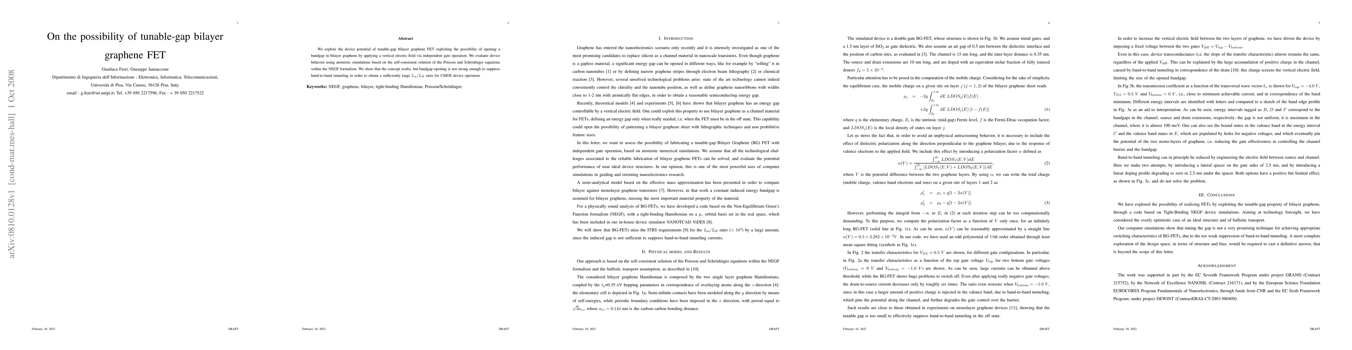The paper presents a code-based simulation of bilayer graphene FETs using Tight-Binding NEGF devices, demonstrating the tunable-gap property in bilayer graphene for potential FET applications.