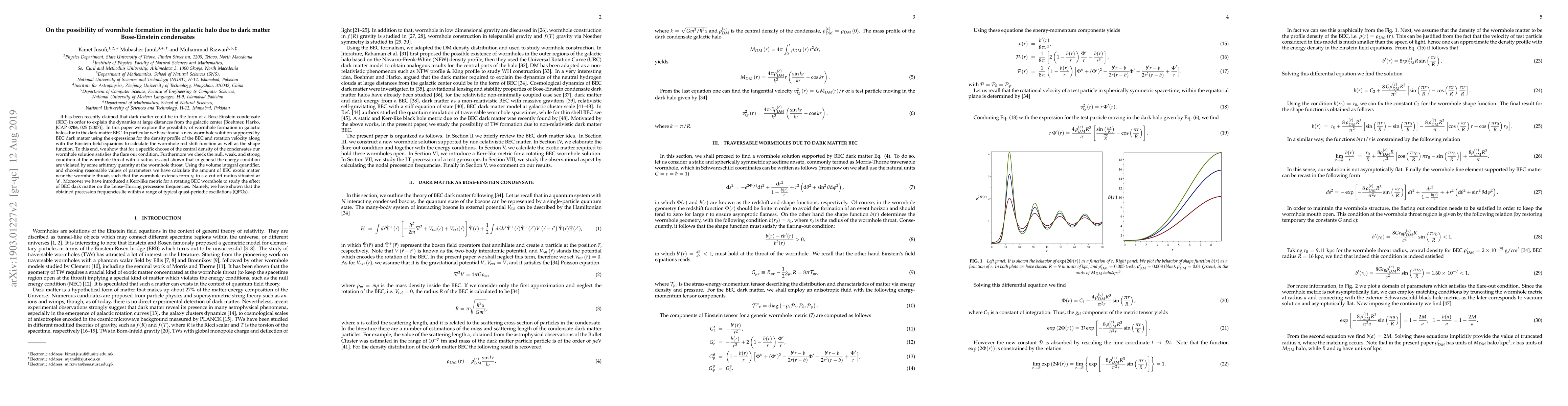 It has been recently claimed that dark matter could be in the form of a Bose-Einstein condensate (BEC) in order to explain the dynamics at large distances from the galactic center [Boehmer, Harko, JCAP {\bf 0706}, 025 (2007)]. In this paper we explore the possibility of wormhole formation in galactic halos due to the dark matter BEC. In particular we have found a new wormhole solution supported by BEC dark matter using the expressions for the density profile of the BEC and rotation velocity along with the Einstein field equations to calculate the wormhole red shift function as well as the shape function. To this end, we show that for a specific choose of the central density of the condensates our wormhole solution satisfies the flare our condition. Furthermore we check the null, weak, and strong condition at the wormhole throat with a radius $r_0$, and shown that in general the energy condition are violated by some arbitrary quantity at the wormhole throat. Using the volume integral quantifier, and choosing reasonable values of parameters we have calculate the amount of BEC exotic matter near the wormhole throat, such that the wormhole extends form $r_0$ to a a cut off radius situated at $`a'$. Moreover we have introduced a Kerr-like metric for a rotating BEC wormhole to study the effect of BEC dark matter on the Lense-Thirring precession frequencies. Namely, we have shown that the obtained precession frequencies lie within a range of typical quasi-periodic oscillations (QPOs).