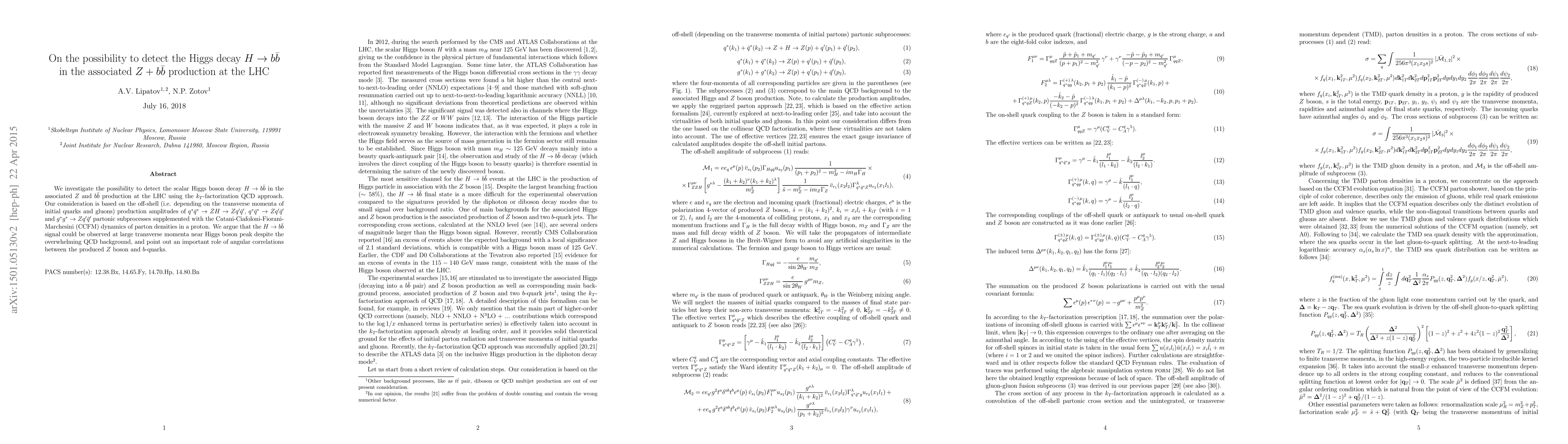 We investigate the possibility to detect the scalar Higgs boson decay $H\to b\bar b$ in the associated $Z$ and $b\bar b$ production at the LHC using the $k_T$-factorization QCD approach. Our consideration is based on the off-shell (i.e. depending on the transverse momenta of initial quarks and gluons) production amplitudes of $q^* \bar q^* \to Z H \to Z q^\prime \bar q^\prime$, $q^* \bar q^* \to Z q^\prime \bar q^\prime$ and $g^* g^* \to Z q^\prime \bar q^\prime$ partonic subprocesses supplemented with the Catani-Ciafoloni-Fiorani-Marchesini (CCFM) dynamics of parton densities in a proton. We argue that the $H \to b\bar b$ signal could be observed at large transverse momenta near Higgs boson peak despite the overwhelming QCD background, and point out an important role of angular correlations between the produced $Z$ boson and $b$-quarks.