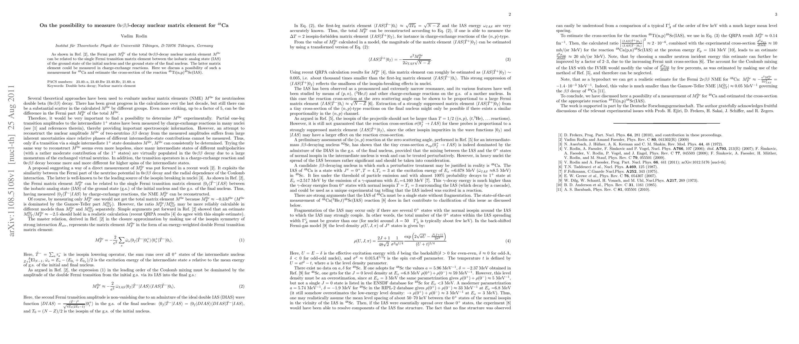 As shown in Ref. \cite{Rod09}, the Fermi part $M_{F}^{0\nu}$ of the total $0\nu\beta\beta$-decay nuclear matrix element $M^{0\nu}$ can be related to the single Fermi transition matrix element between the isobaric analog state (IAS) of the ground state of the initial nucleus and the ground state of the final nucleus. The latter matrix element could be measured in charge-exchange reactions. Here we discuss a possibility of such a measurement for $^{48}$Ca and estimate the cross-section of the reaction $^{48}$Ti(n,p)$^{48}$Sc(IAS).