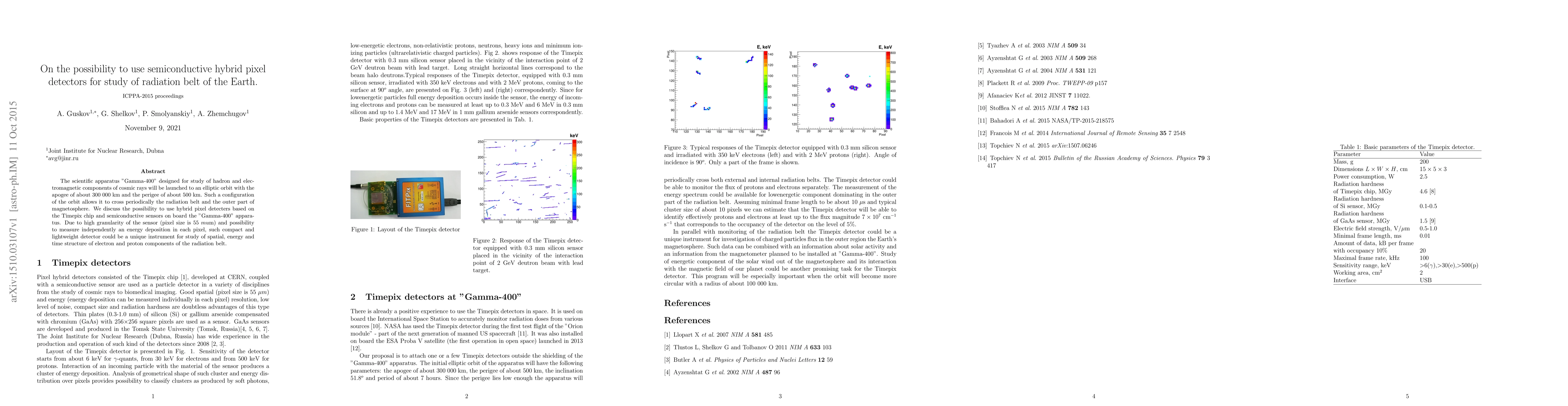 The scientific apparatus "Gamma-400" designed for study of hadron and electromagnetic components of cosmic rays will be launched to an elliptic orbit with the apogee of about 300 000 km and the perigee of about 500 km. Such a configuration of the orbit allows it to cross periodically the radiation belt and the outer part of magnetosphere. We discuss the possibility to use hybrid pixel detecters based on the Timepix chip and semiconductive sensors on board the "Gamma-400" apparatus. Due to high granularity of the sensor (pixel size is 55 $mu$m) and possibility to measure independently an energy deposition in each pixel, such compact and lightweight detector could be a unique instrument for study of spatial, energy and time structure of electron and proton components of the radiation belt.
