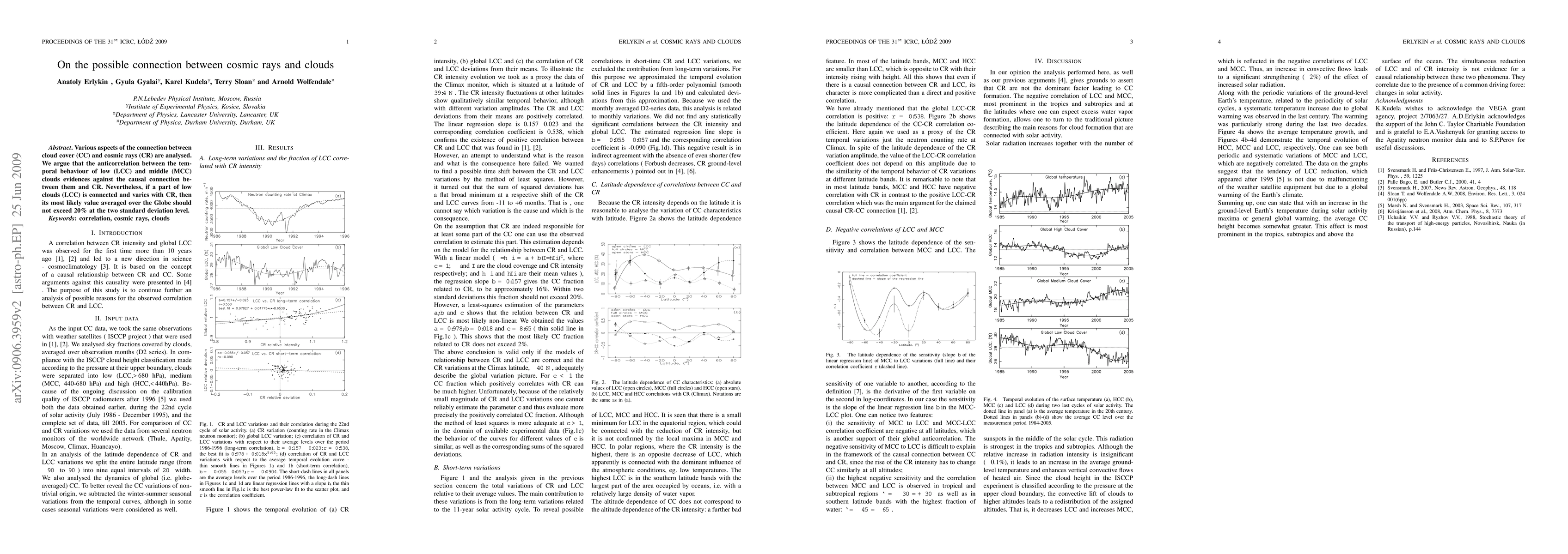 Various aspects of the connection between cloud cover (CC) and cosmic rays (CR) are analysed. We argue that the anticorrelation between the temporal behaviour of low (LCC) and middle (MCC) clouds evidences against causal connection between them and CR. Nevertheless, if a part of low clouds (LCC) is connected and varies with CR, then its most likely value averaged over the Globe should not exceed 20% at the two standard deviation level.