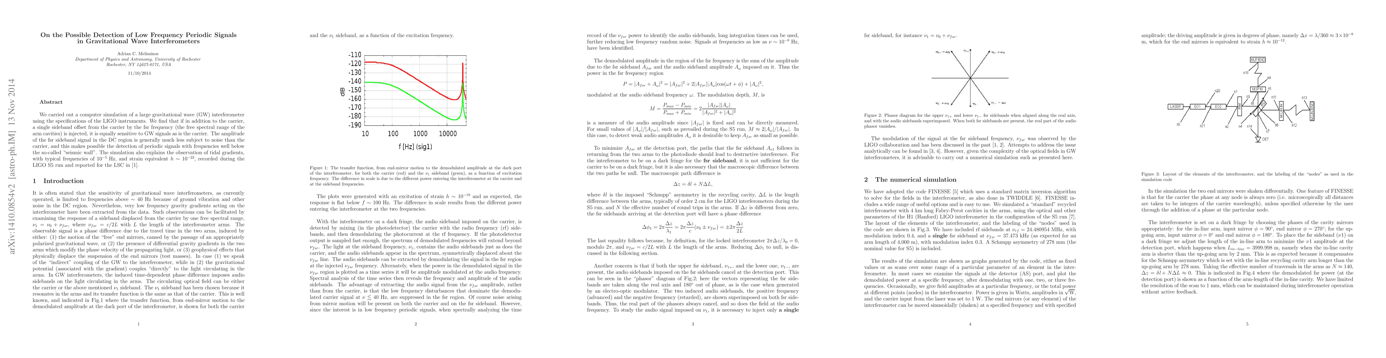 We carried out a computer simulation of a large gravitational wave (GW) interferometer using the specifications of the LIGO instruments. We find that if in addition to the carrier, a single sideband offset from the carrier by the fsr frequency (the free spectral range of the arm cavities) is injected, it is equally sensitive to GW signals as is the carrier. The amplitude of the fsr sideband signal in the DC region is generally much less subject to noise than the carrier, and this makes possible the detection of periodic signals with frequencies well below the so-called seismic wall.