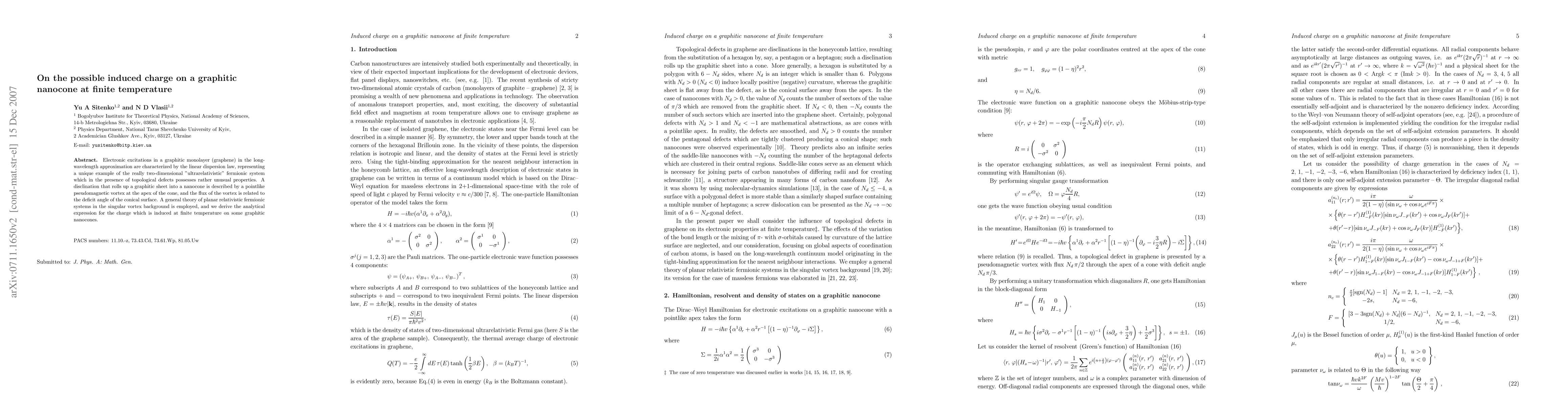 Electronic excitations in a graphitic monolayer (graphene) in the long-wavelength approximation are characterized by the linear dispersion law, representing a unique example of the really two-dimensional "ultrarelativistic" fermionic system which in the presence of topological defects possesses rather unusual properties. A disclination that rolls up a graphitic sheet into a nanocone is described by a pointlike pseudomagnetic vortex at the apex of the cone, and the flux of the vortex is related to the deficit angle of the conical surface. A general theory of planar relativistic fermionic systems in the singular vortex background is employed, and we derive the analytical expression for the charge which is induced at finite temperature on some graphitic nanocones.
