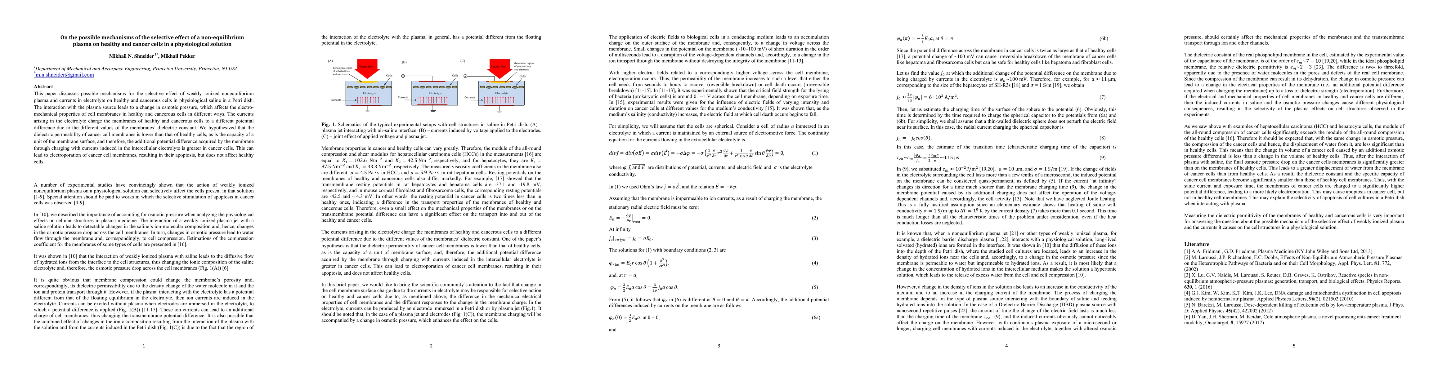 This paper explores the selective impact of non-equilibrium plasma on healthy and cancerous cells in physiological saline, suggesting that cancer cells undergo electroporation and apoptosis due to a lower dielectric permeability and higher membrane potential difference compared to healthy cells.