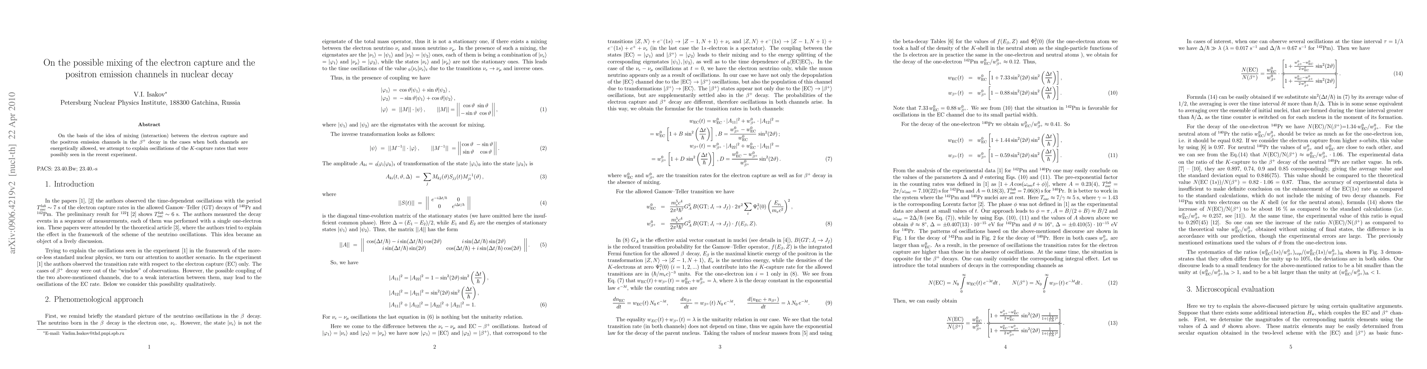 Summary: The paper explores the interaction between electron capture and positron emission channels in nuclear decay, proposing that their mixing could explain observed oscillations in K-capture rates in recent experiments.