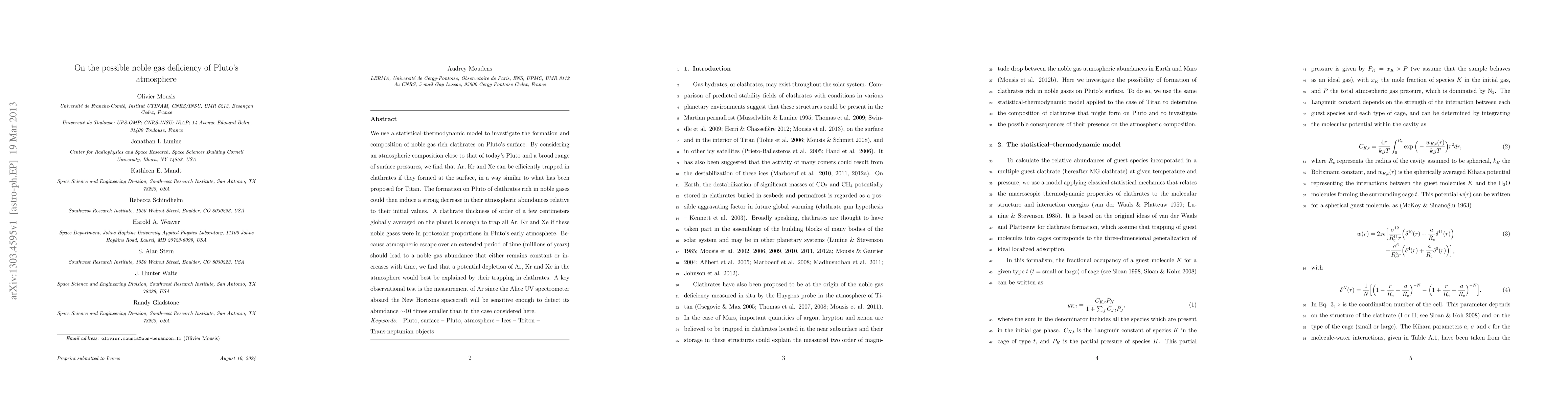 This paper investigates the potential depletion of noble gases (Ar, Kr, Xe) in Pluto's atmosphere through the formation of clathrates on its surface. The study suggests that these gases could be trapped efficiently in clathrates, leading to a significant decrease in their atmospheric abundances, which contrasts with the expected increase due to atmospheric escape over time.
