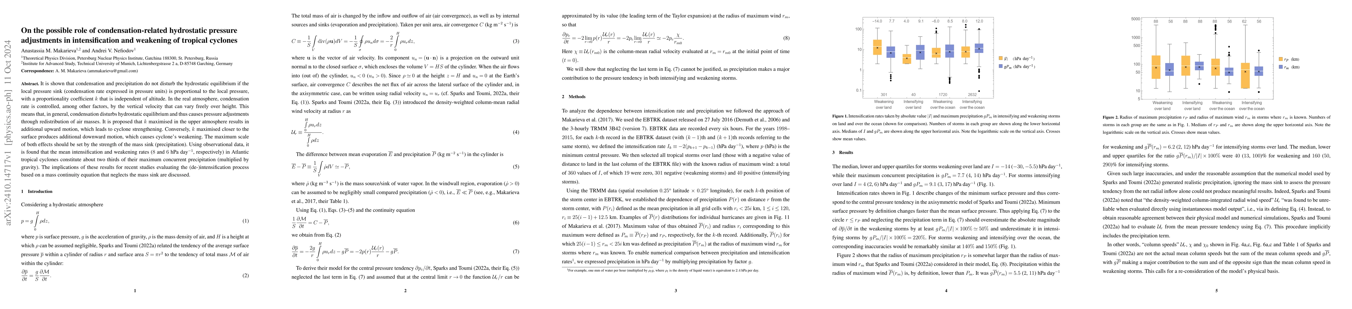 This research explores how condensation-related hydrostatic pressure adjustments influence tropical cyclone intensification and weakening. It finds that while condensation generally disrupts hydrostatic equilibrium, a proportional condensation rate ($k$) that maximizes in the upper atmosphere can lead to cyclone strengthening, whereas maximizing closer to the surface can result in weakening. The study also notes that observed intensification and weakening rates are correlated with precipitation, suggesting important implications for models that overlook precipitation sinks.
