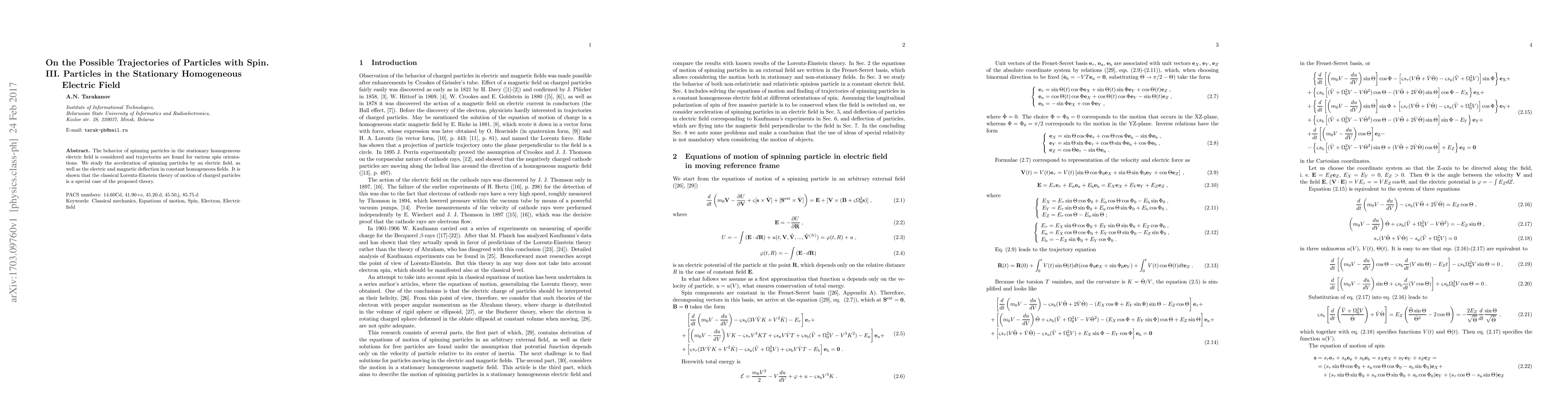 This paper explores the trajectories of spinning particles in a stationary homogeneous electric field, revealing their acceleration and deflection due to electric and magnetic forces. It extends the classical Lorentz-Einstein theory to include spinning particles, demonstrating a broader framework.