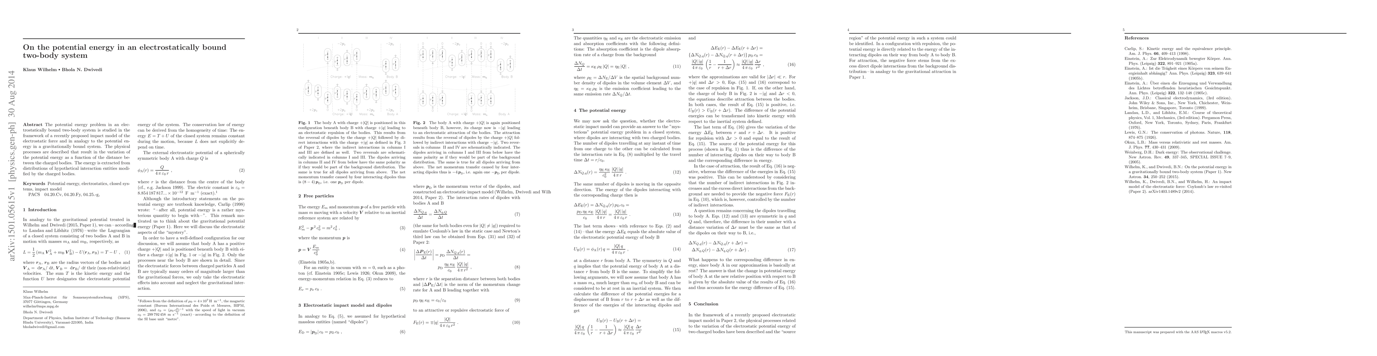 This paper explores the potential energy in electrostatically bound two-body systems using an impact model of electrostatic force, similar to gravitational binding. It details processes affecting energy variation with distance, deriving energy from hypothetical interaction entities modified by charged bodies.