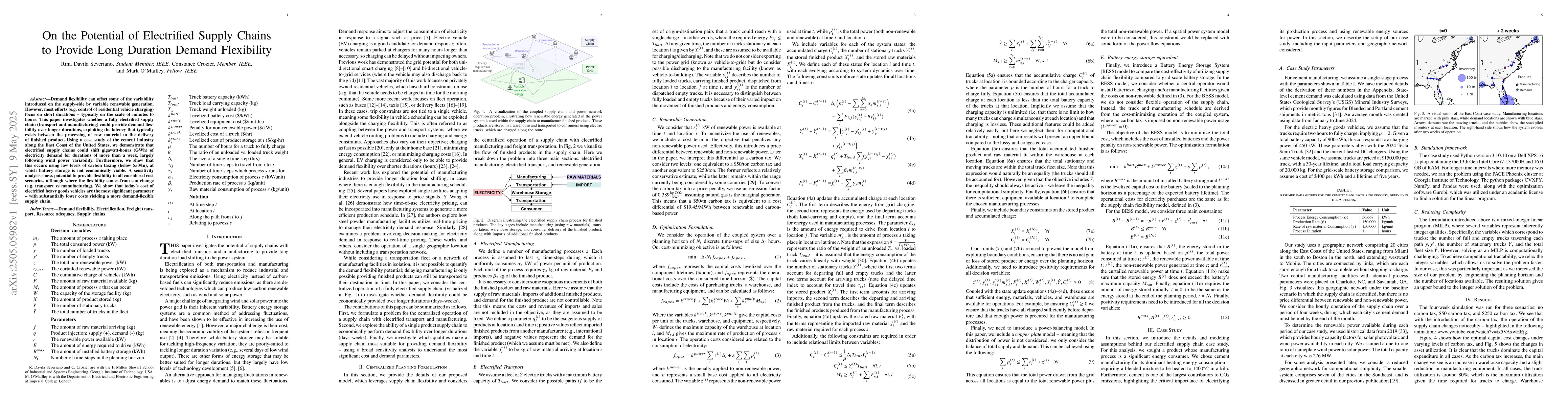 The paper uses a case study of the cement industry along the East Coast of the US to investigate the potential of electrified supply chains in providing long-duration demand flexibility, exploiting latency between raw material processing and finished product delivery.
