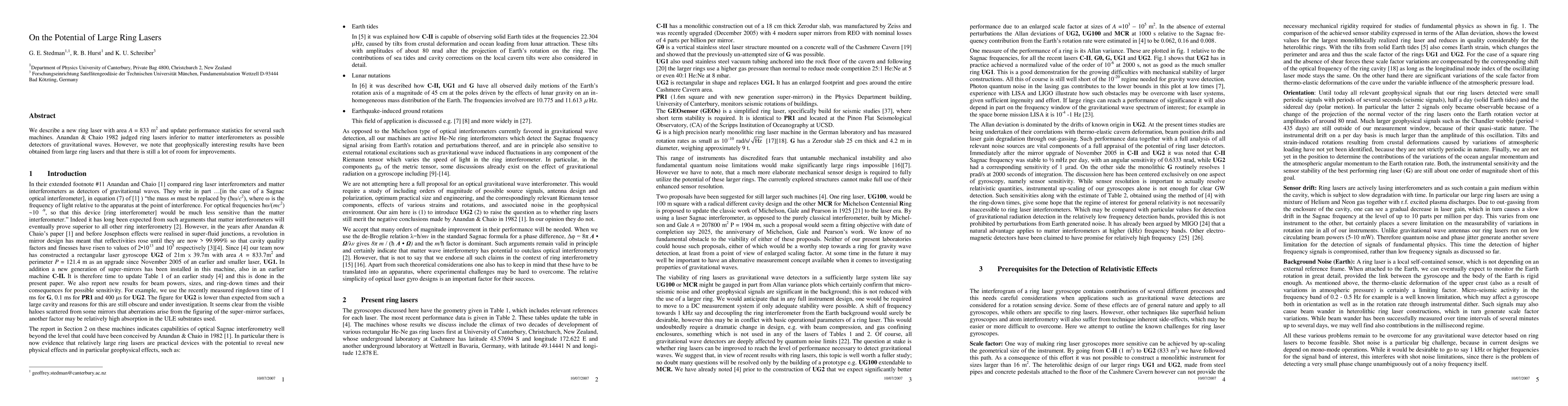We describe a new ring laser with area A = 833 m^2 and update performance statistics for several such machines. Anandan & Chaio 1982 judged ring lasers inferior to matter interferometers as possible detectors of gravitational waves. However, we note that geophysically interesting results have been obtained from large ring lasers and that there is still a lot of room for improvements.