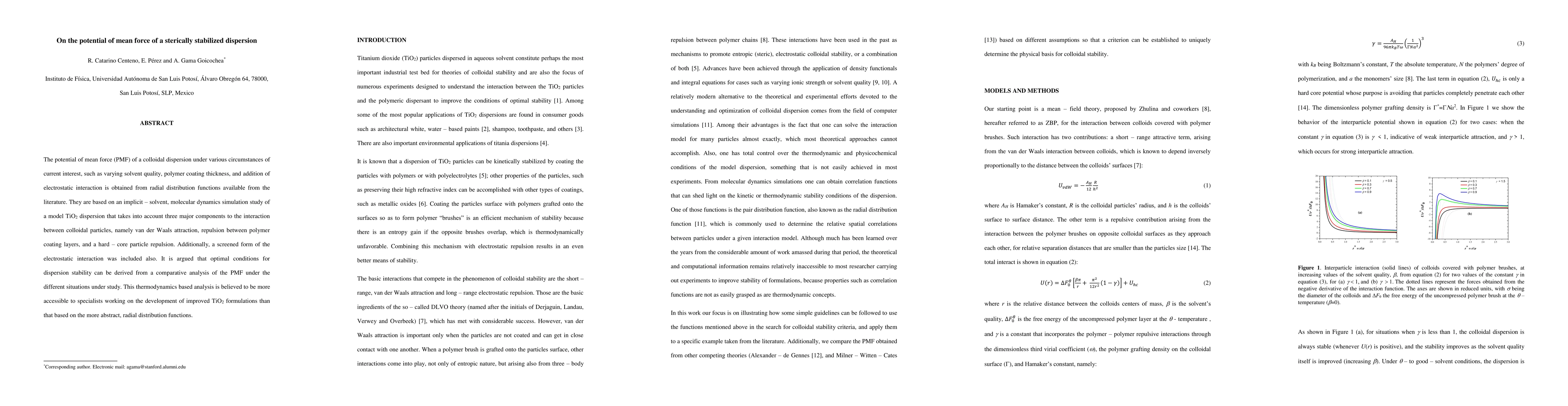 The potential of mean force (PMF) of a colloidal dispersion under various circumstances of current interest, such as varying solvent quality, polymer coating thickness, and addition of electrostatic interaction is obtained from radial distribution functions available from the literature. They are based on an implicit solvent, molecular dynamics simulation study of a model titania dispersion that takes into account three major components to the interaction between colloidal particles, namely van der Waals attraction, repulsion between polymer coating layers, and a hard core particle repulsion. Additionally, a screened form of the electrostatic interaction was included also. It is argued that optimal conditions for dispersion stability can be derived from a comparative analysis of the PMF under the different situations under study. This thermodynamics based analysis is believed to be more accessible to specialists working on the development of improved titania formulations than that based on the more abstract, radial distribution functions.