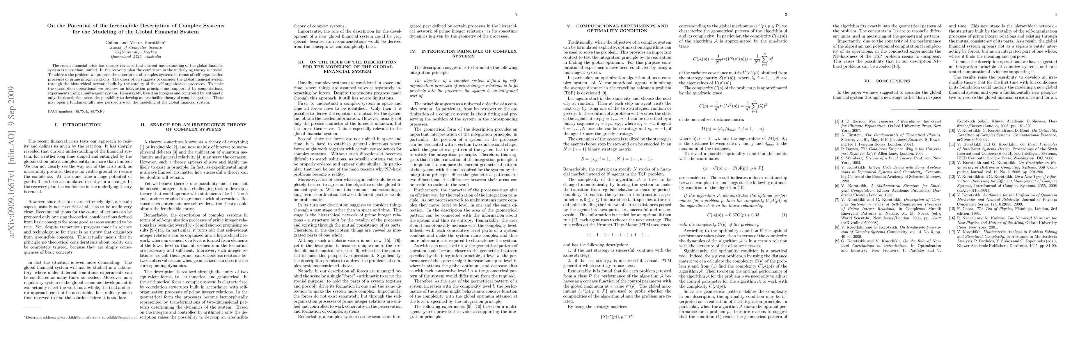 This paper proposes a novel approach to model the global financial system by describing complex systems through self-organization processes of prime integer relations, suggesting a hierarchical network framework. Computational experiments using a multi-agent system support the integration principle, aiming to develop an irreducible theory for complex systems.
