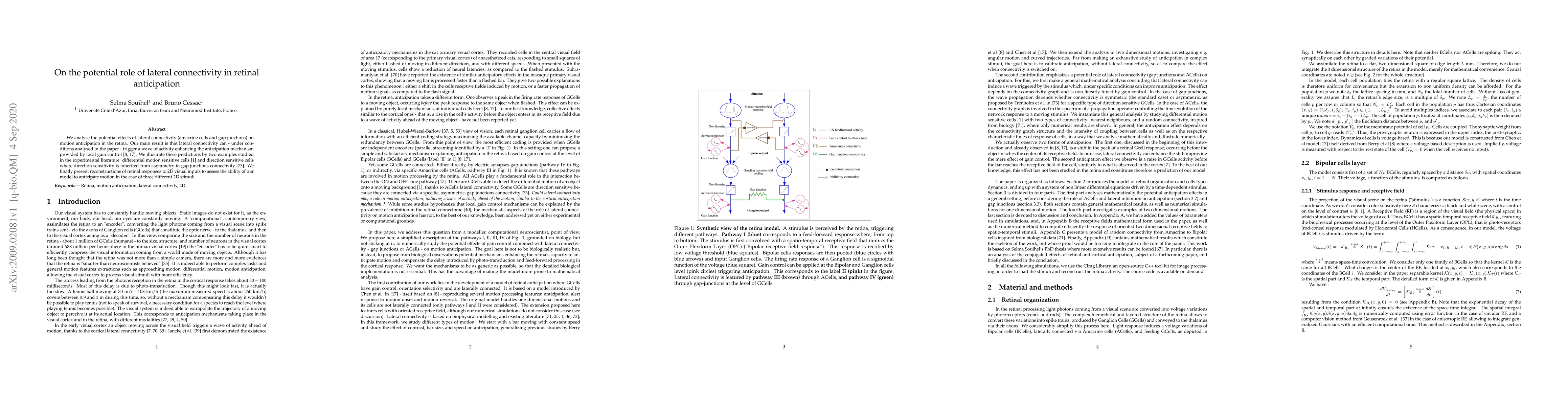 We analyse the potential effects of lateral connectivity (amacrine cells and gap junctions) on motion anticipation in the retina. Our main result is that lateral connectivity can-under conditions analysed in the paper-trigger a wave of activity enhancing the anticipation mechanism provided by local gain control [8, 17]. We illustrate these predictions by two examples studied in the experimental literature: differential motion sensitive cells [1] and direction sensitive cells where direction sensitivity is inherited from asymmetry in gap junctions connectivity [73]. We finally present reconstructions of retinal responses to 2D visual inputs to assess the ability of our model to anticipate motion in the case of three different 2D stimuli.
