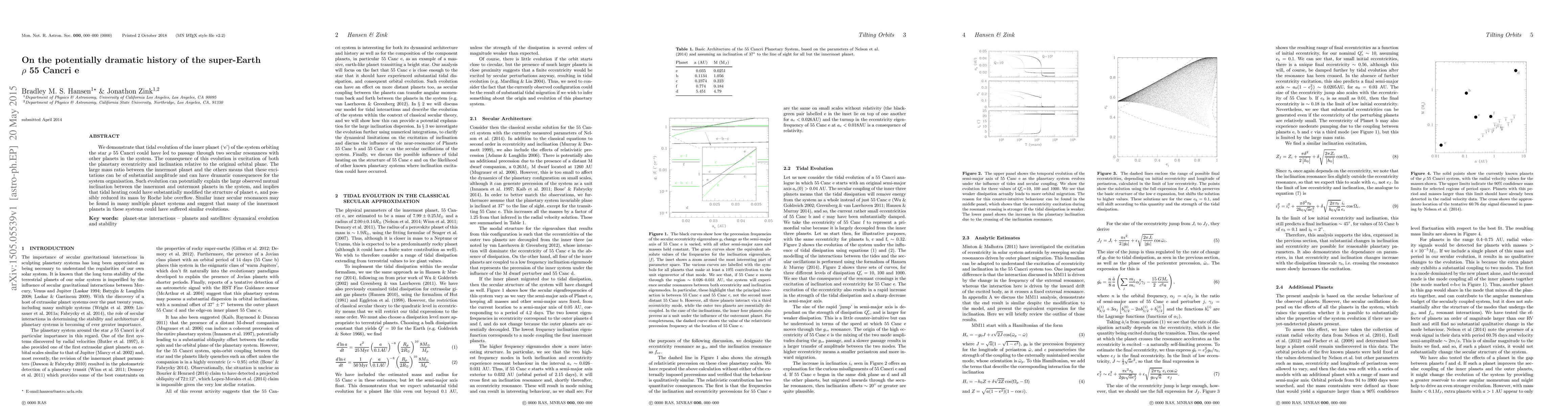 We demonstrate that tidal evolution of the inner planet (`e') of the system orbiting the star rho 55 Cancri could have led to passage through two secular resonances with other planets in the system. The consequence of this evolution is excitation of both the planetary eccentricity and inclination relative to the original orbital plane. The large mass ratio between the innermost planet and the others means that these excitations can be of substantial amplitude and can have dramatic consequences for the system organisation. Such evolution can potentially explain the large observed mutual inclination between the innermost and outermost planets in the system, and implies that tidal heating could have substantially modified the structure of planet e, and possibly reduced its mass by Roche lobe overflow. Similar inner secular resonances may be found in many multiple planet systems and suggest that many of the innermost planets in these systems could have suffered similar evolutions.
