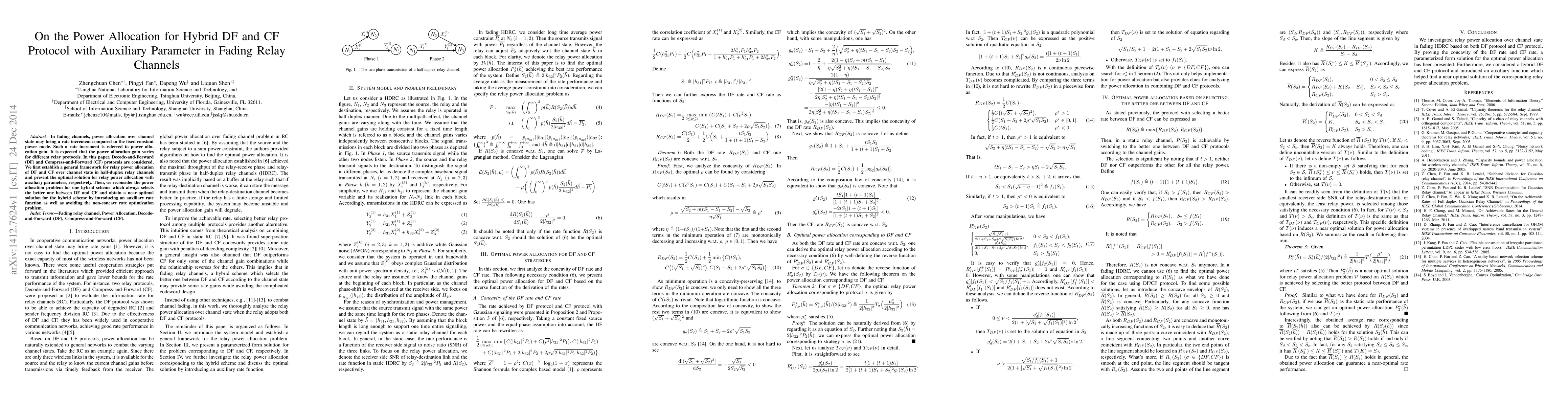 This paper develops a framework for optimal power allocation in hybrid Decode-and-Forward (DF) and Compress-and-Forward (CF) relay protocols in fading channels, aiming to maximize rate increment. It presents near-optimal solutions for both individual and hybrid DF/CF protocols using auxiliary parameters.