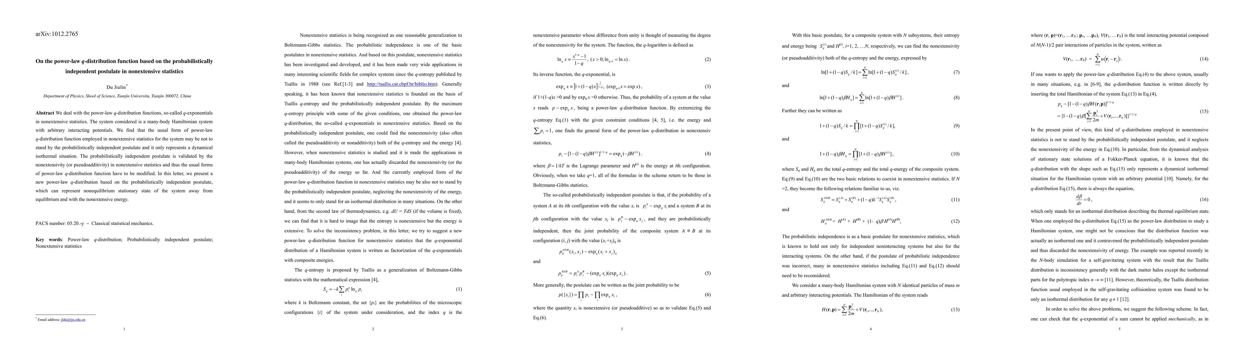 We deal with the power-law q-distribution functions, so-called q-exponentials in nonextensive statistics. The system considered is a many-body Hamiltonian system with arbitrary interacting potentials. We find that the usual form of power-law q-distribution function employed in nonextensive statistics for the system may be not to stand by the probabilistically independent postulate and it only represents a dynamical isothermal situation. The probabilistically independent postulate is validated by the nonextensivity (or pseudoadditivity) in nonextensive statistics and thus the usual forms of power-law q-distribution function have to be modified. In this letter, we present a new power-law q-distribution based on the probabilistically independent postulate, which can represent nonequilibrium stationary state of the system away from equilibrium and with the nonextensive energy.