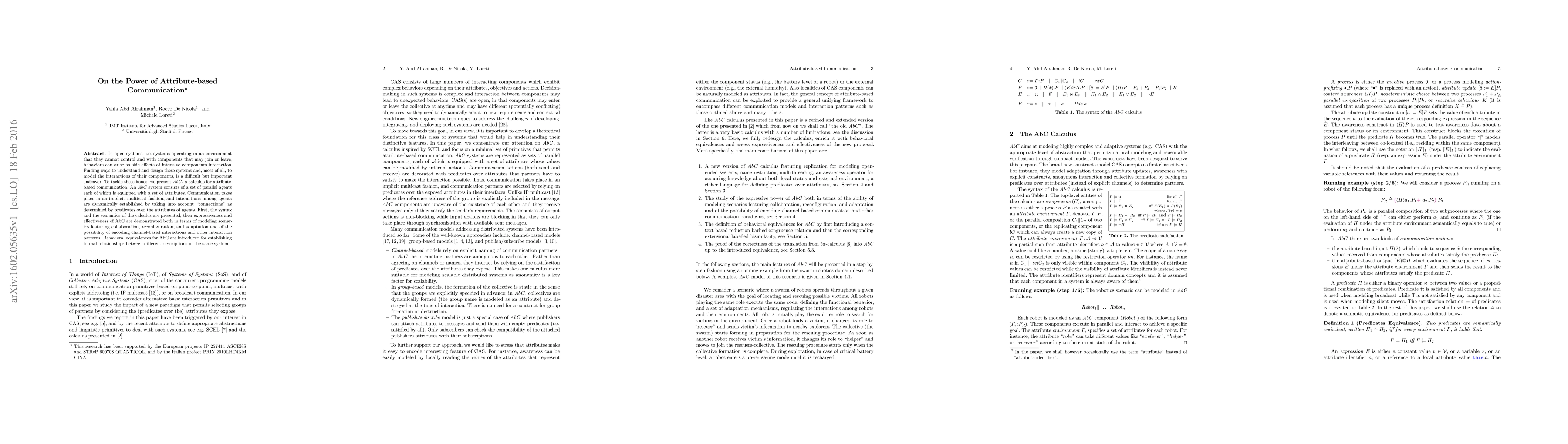 In open systems, i.e. systems operating in an environment that they cannot control and with components that may join or leave, behaviors can arise as side effects of intensive components interaction. Finding ways to understand and design these systems and, most of all, to model the interactions of their components, is a difficult but important endeavor. To tackle these issues, we present AbC, a calculus for attribute-based communication. An AbC system consists of a set of parallel agents each of which is equipped with a set of attributes. Communication takes place in an implicit multicast fashion, and interactions among agents are dynamically established by taking into account "connections" as determined by predicates over the attributes of agents. First, the syntax and the semantics of the calculus are presented, then expressiveness and effectiveness of AbC are demonstrated both in terms of modeling scenarios featuring collaboration, reconfiguration, and adaptation and of the possibility of encoding channel-based interactions and other interaction patterns. Behavioral equivalences for AbC are introduced for establishing formal relationships between different descriptions of the same system.