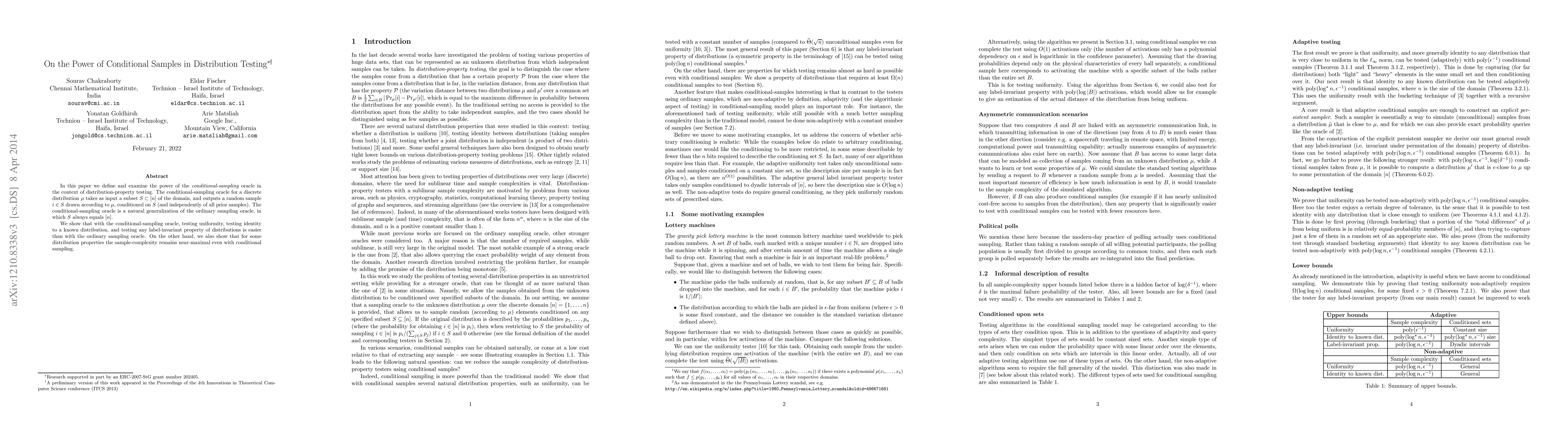 The paper defines and examines the conditional-sampling oracle, a generalization of the ordinary sampling oracle, in the context of distribution-property testing.