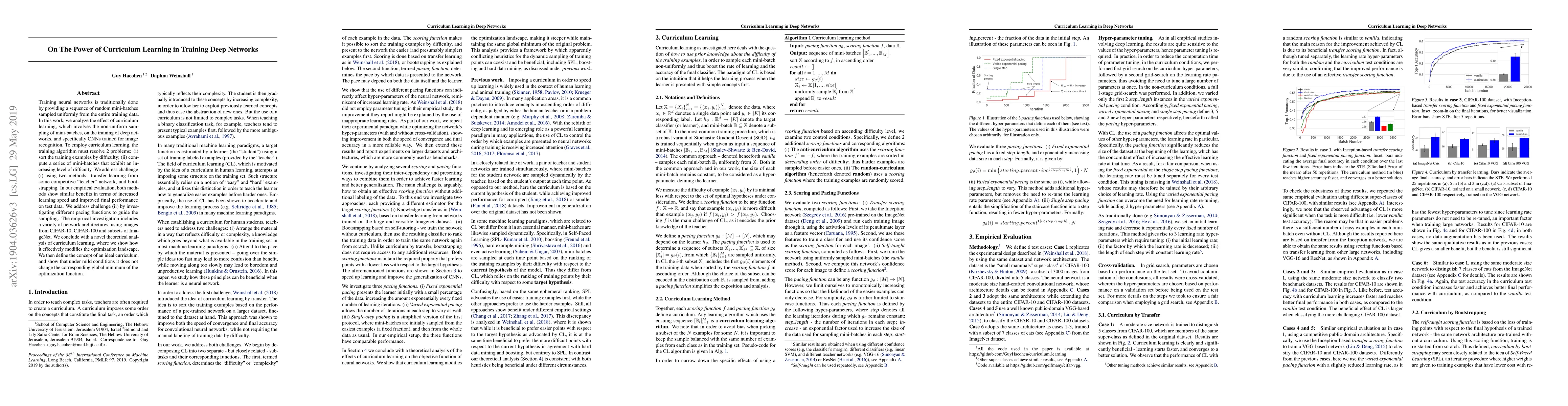 Training neural networks is traditionally done by providing a sequence of random mini-batches sampled uniformly from the entire training data. In this work, we analyze the effect of curriculum learning, which involves the non-uniform sampling of mini-batches, on the training of deep networks, and specifically CNNs trained for image recognition. To employ curriculum learning, the training algorithm must resolve 2 problems: (i) sort the training examples by difficulty; (ii) compute a series of mini-batches that exhibit an increasing level of difficulty. We address challenge (i) using two methods: transfer learning from some competitive ``teacher" network, and bootstrapping. In our empirical evaluation, both methods show similar benefits in terms of increased learning speed and improved final performance on test data. We address challenge (ii) by investigating different pacing functions to guide the sampling. The empirical investigation includes a variety of network architectures, using images from CIFAR-10, CIFAR-100 and subsets of ImageNet. We conclude with a novel theoretical analysis of curriculum learning, where we show how it effectively modifies the optimization landscape. We then define the concept of an ideal curriculum, and show that under mild conditions it does not change the corresponding global minimum of the optimization function.