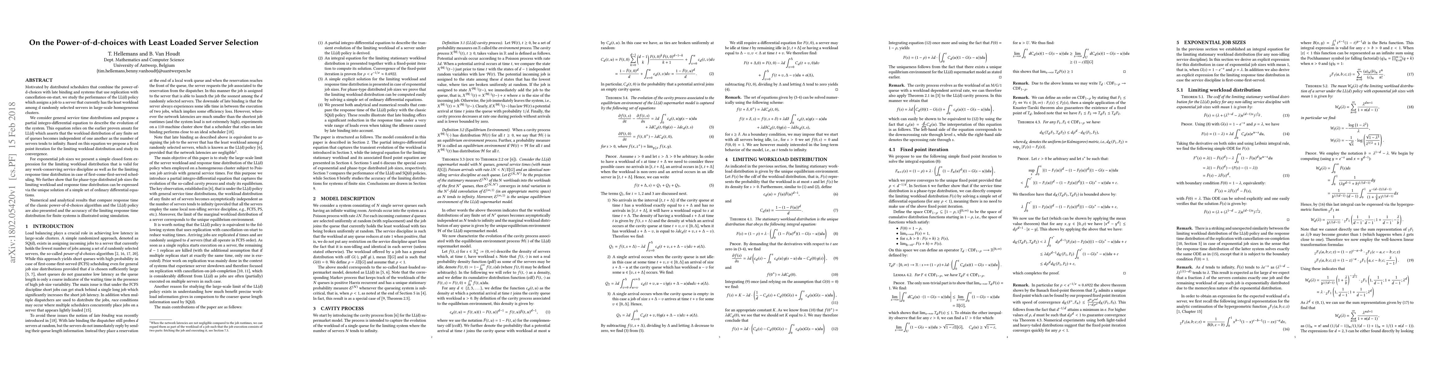Motivated by distributed schedulers that combine the power-of-d-choices with late binding and systems that use replication with cancellation-on-start, we study the performance of the LL(d) policy which assigns a job to a server that currently has the least workload among d randomly selected servers in large-scale homogeneous clusters. We consider general service time distributions and propose a partial integro-differential equation to describe the evolution of the system. This equation relies on the earlier proven ansatz for LL(d) which asserts that the workload distribution of any finite set of queues becomes independent of one another as the number of servers tends to infinity. Based on this equation we propose a fixed point iteration for the limiting workload distribution and study its convergence. For exponential job sizes we present a simple closed form expression for the limiting workload distribution that is valid for any work-conserving service discipline as well as for the limiting response time distribution in case of first-come-first-served scheduling. We further show that for phase-type distributed job sizes the limiting workload and response time distribution can be expressed via the unique solution of a simple set of ordinary differential equations. Numerical and analytical results that compare response time of the classic power-of-d-choices algorithm and the LL(d) policy are also presented and the accuracy of the limiting response time distribution for finite systems is illustrated using simulation.