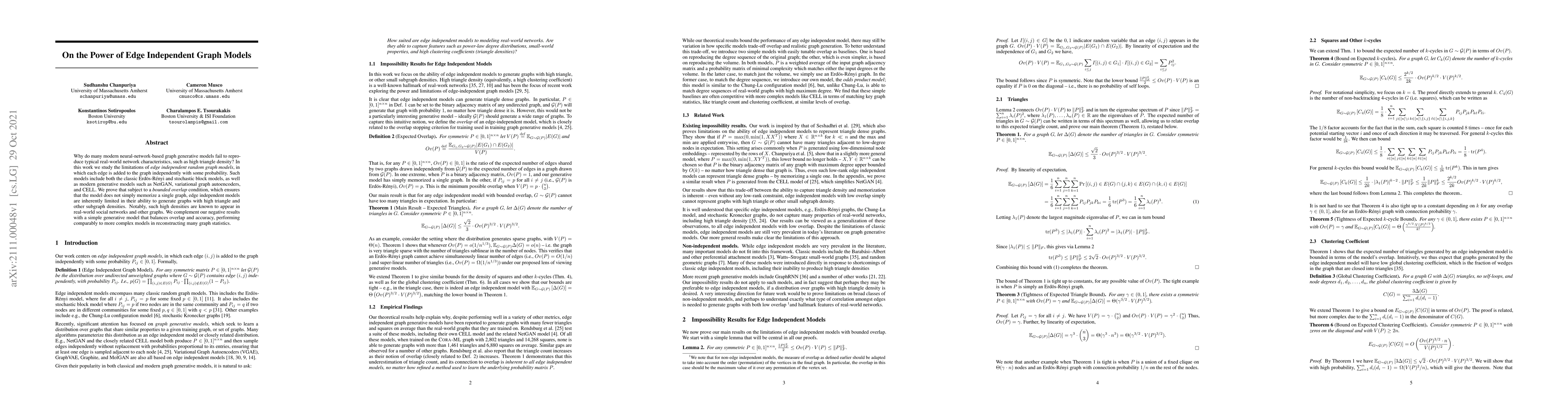 This paper investigates why edge independent graph models fail to reproduce typical real-world network characteristics, such as high triangle density, and proves their inherent limitations in generating graphs with such densities. It proposes a simple generative model that balances overlap and accuracy, performing well in reconstructing various graph statistics.