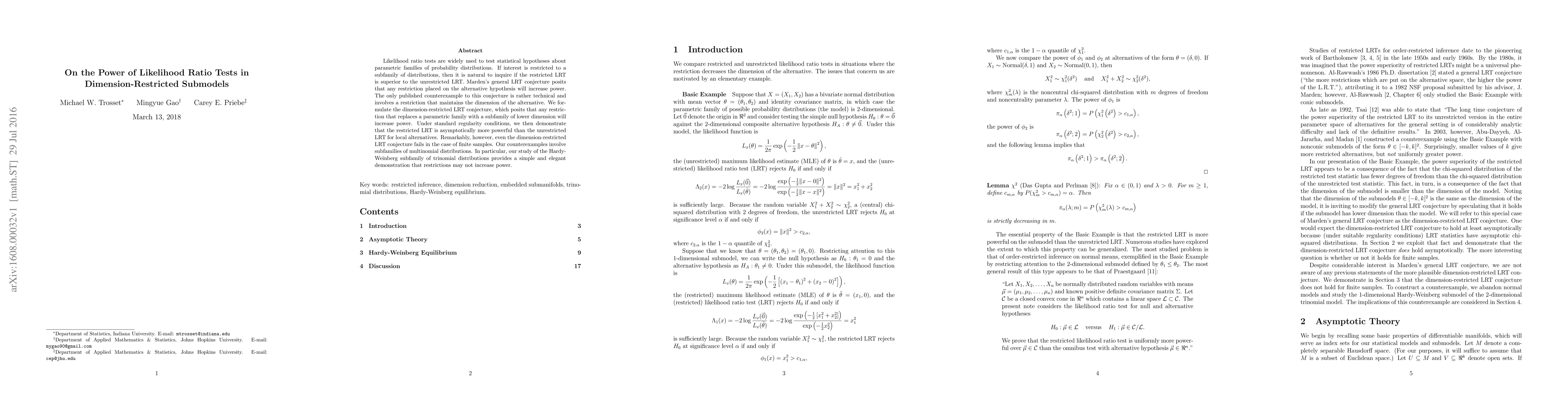 This paper explores the power of likelihood ratio tests (LRT) under dimension-restricted submodels, proposing that restricting to lower-dimensional subfamilies increases test power. It demonstrates that while the conjecture holds asymptotically, it fails in finite samples, illustrated by counterexamples in multinomial distributions, notably the Hardy-Weinberg submodel.