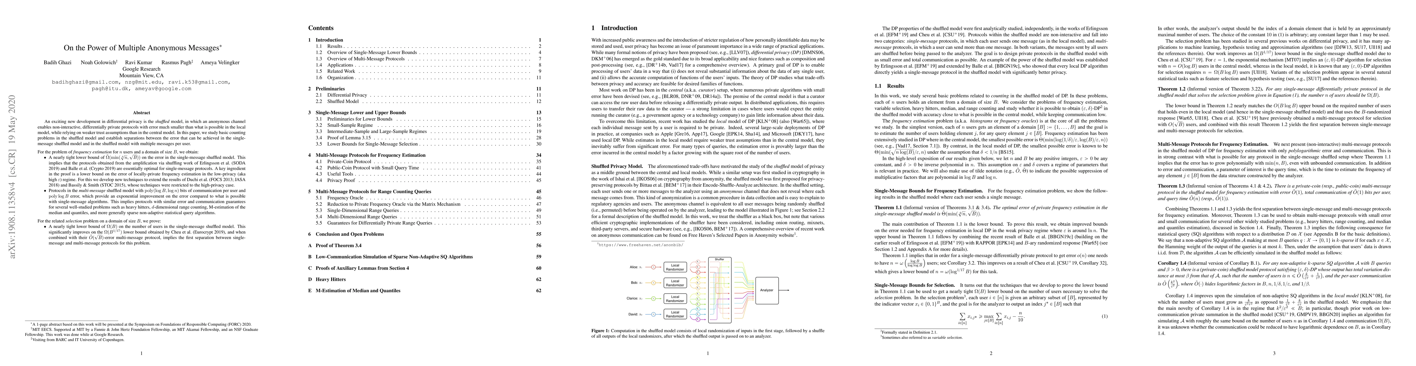 An exciting new development in differential privacy is the shuffled model, in which an anonymous channel enables non-interactive, differentially private protocols with error much smaller than what is possible in the local model, while relying on weaker trust assumptions than in the central model. In this paper, we study basic counting problems in the shuffled model and establish separations between the error that can be achieved in the single-message shuffled model and in the shuffled model with multiple messages per user. For the problem of frequency estimation for $n$ users and a domain of size $B$, we obtain: - A nearly tight lower bound of $\tilde{\Omega}( \min(\sqrt[4]{n}, \sqrt{B}))$ on the error in the single-message shuffled model. This implies that the protocols obtained from the amplification via shuffling work of Erlingsson et al. (SODA 2019) and Balle et al. (Crypto 2019) are essentially optimal for single-message protocols. A key ingredient in the proof is a lower bound on the error of locally-private frequency estimation in the low-privacy (aka high $\epsilon$) regime. - Protocols in the multi-message shuffled model with $poly(\log{B}, \log{n})$ bits of communication per user and $poly\log{B}$ error, which provide an exponential improvement on the error compared to what is possible with single-message algorithms. For the related selection problem on a domain of size $B$, we prove: - A nearly tight lower bound of $\Omega(B)$ on the number of users in the single-message shuffled model. This significantly improves on the $\Omega(B^{1/17})$ lower bound obtained by Cheu et al. (Eurocrypt 2019), and when combined with their $\tilde{O}(\sqrt{B})$-error multi-message protocol, implies the first separation between single-message and multi-message protocols for this problem.