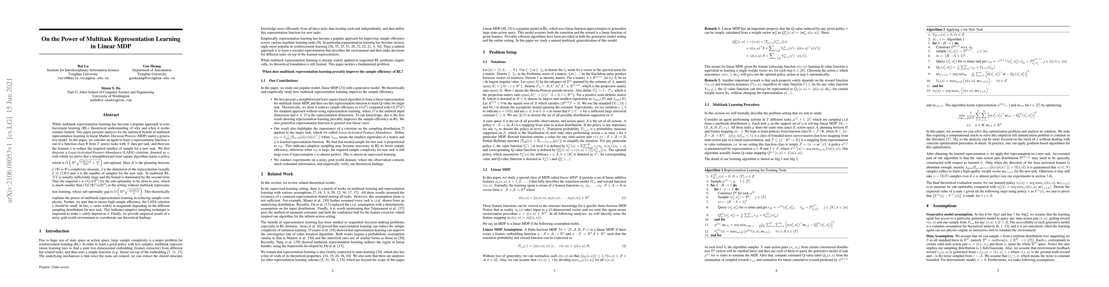 This paper analyzes the theoretical benefits of multitask representation learning in linear Markov Decision Processes (MDPs), demonstrating that it significantly reduces sample complexity compared to single-task learning. It introduces the Least-Activated-Feature-Abundance (LAFA) criterion to show that multitask learning can achieve near-optimality with fewer samples, emphasizing the importance of adaptive sampling techniques.