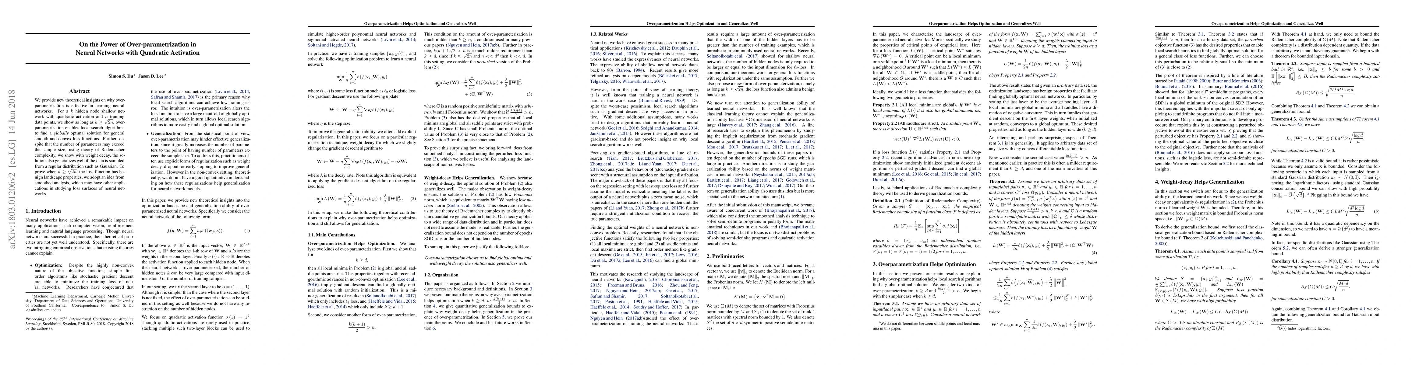This paper demonstrates that over-parametrization in shallow neural networks with quadratic activations can lead to globally optimal solutions using local search algorithms, provided the number of hidden nodes is at least $\sqrt{2n}$. It also shows that with weight decay, these networks can generalize well despite having more parameters than training samples, leveraging Rademacher complexity.