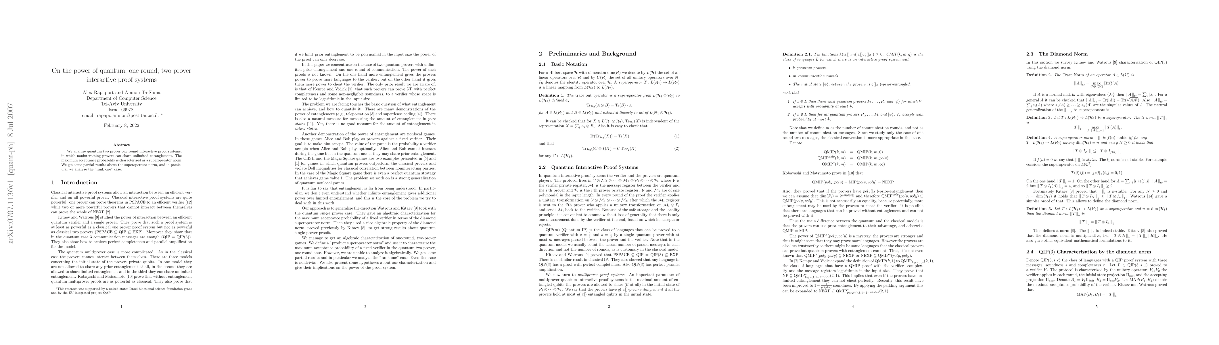 This paper investigates quantum interactive proof systems with two noninteracting provers and one round of communication, allowing unlimited entanglement. It characterizes the maximum acceptance probability as a superoperator norm and provides partial results, particularly focusing on the "rank one" case.