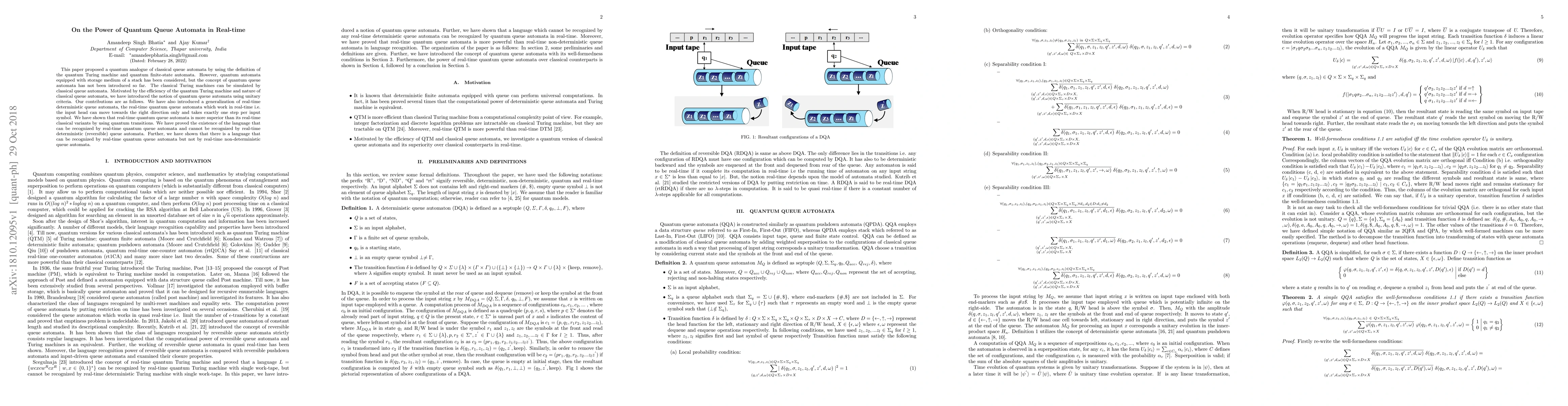 This paper introduces quantum queue automata, a quantum analogue of classical queue automata, and demonstrates their superiority over classical variants through real-time quantum transitions. It also proves the existence of languages recognized by real-time quantum queue automata but not by classical deterministic or non-deterministic queue automata.