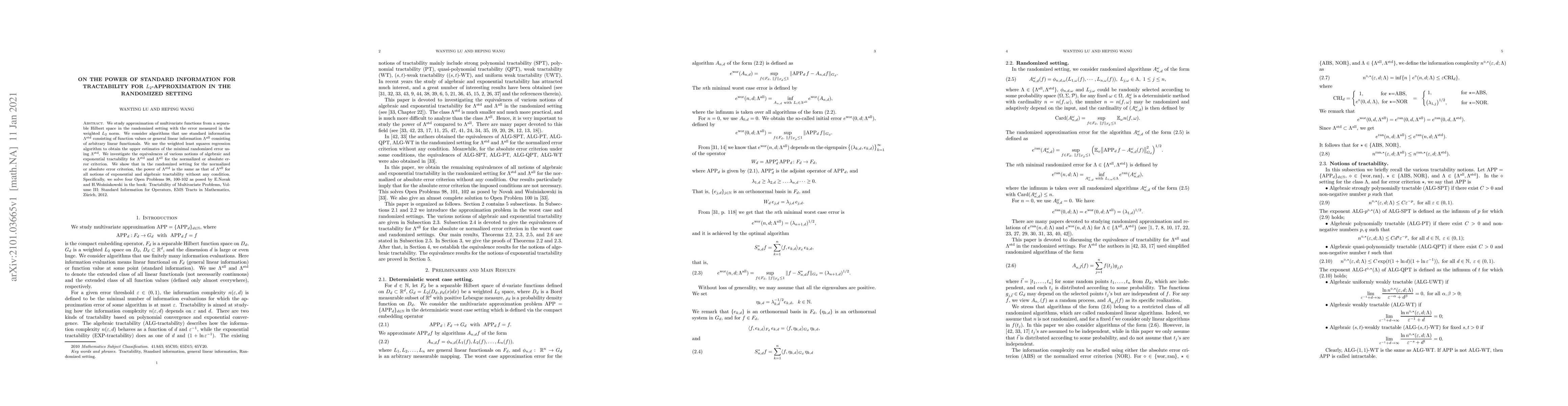 We study approximation of multivariate functions from a separable Hilbert space in the randomized setting with the error measured in the weighted $L_2$ norm. We consider algorithms that use standard information $\Lambda^{\rm std}$ consisting of function values or general linear information $\Lambda^{\rm all}$ consisting of arbitrary linear functionals. We use the weighted least squares regression algorithm to obtain the upper estimates of the minimal randomized error using $\Lambda^{\rm std}$. We investigate the equivalences of various notions of algebraic and exponential tractability for $\Lambda^{\rm std}$ and $\Lambda^{\rm all}$ for the normalized or absolute error criterion. We show that in the randomized setting for the normalized or absolute error criterion, the power of $\Lambda^{\rm std}$ is the same as that of $\Lambda^{\rm all}$ for all notions of exponential and algebraic tractability without any condition. Specifically, we solve four Open Problems 98, 100-102 as posed by E.Novak and H.Wo\'zniakowski in the book: Tractability of Multivariate Problems, Volume III: Standard Information for Operators, EMS Tracts in Mathematics, Z\"urich, 2012.