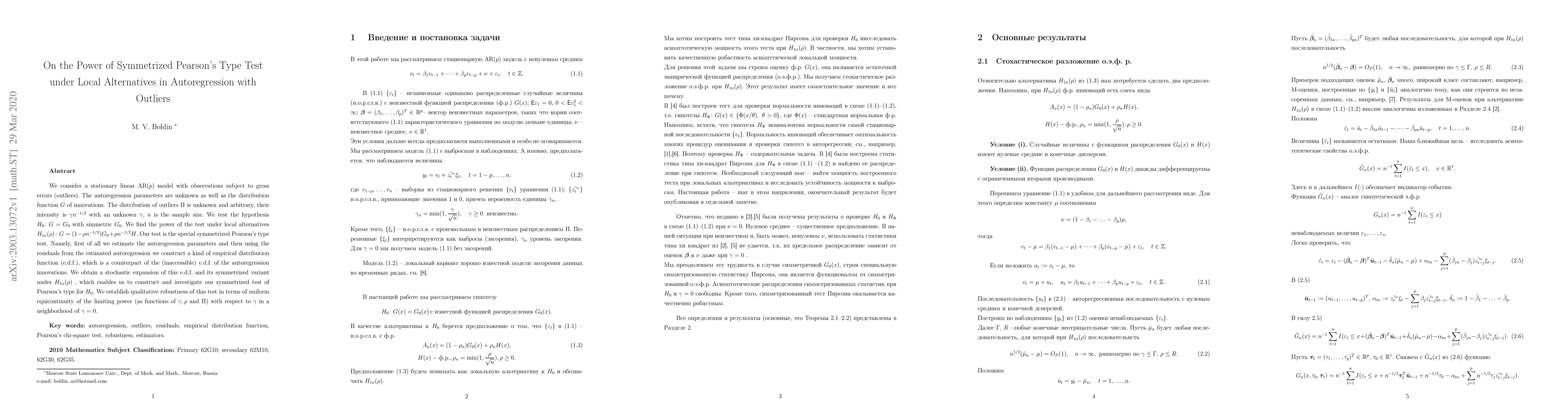 We consider a stationary linear AR($p$) model with observations subject to gross errors (outliers). The autoregression parameters are unknown as well as the distribution function $G$ of innovations. The distribution of outliers $\Pi$ is unknown and arbitrary, their intensity is $\gamma n^{-1/2}$ with an unknown $\gamma$, $n$ is the sample size. We test the hypothesis $H_0\colon G=G_0$ with simmetric $G_0$. We find the power of the test under local alternatives $H_{1n}(\rho)\colon G=(1-\rho n^{-1/2})G_0+\rho n^{-1/2}H$. Our test is the special symmetrized Pearson's type test. Namely, first of all we estimate the autoregression parameters and then using the residuals from the estimated autoregression we construct a kind of empirical distribution function (e.d.f.), which is a counterpart of the (inaccessible) e.d.f. of the autoregression innovations. We obtain a stochastic expansion of this e.d.f. and its symmetrized variant under $H_{1n}(\rho)$ , which enables us to construct and investigate our symmetrized test of Pearson's type for $H_0$. We establish qualitative robustness of this test in terms of uniform equicontinuity of the limiting power (as functions of $\gamma,\rho$ and $\Pi$) with respect to $\gamma$ in a neighborhood of $\gamma=0$.