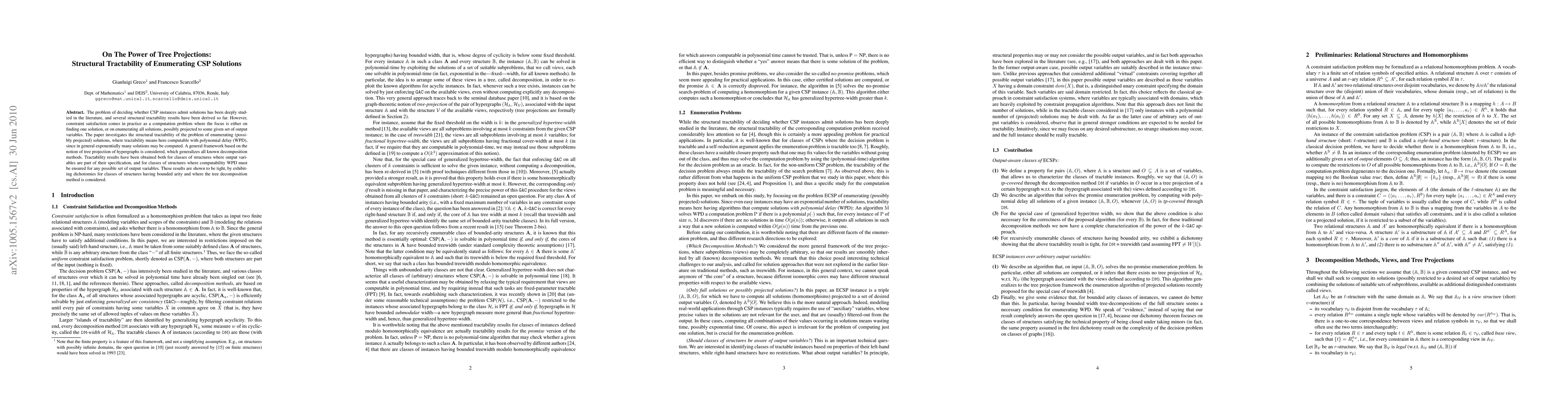 The problem of deciding whether CSP instances admit solutions has been deeply studied in the literature, and several structural tractability results have been derived so far. However, constraint satisfaction comes in practice as a computation problem where the focus is either on finding one solution, or on enumerating all solutions, possibly projected to some given set of output variables. The paper investigates the structural tractability of the problem of enumerating (possibly projected) solutions, where tractability means here computable with polynomial delay (WPD), since in general exponentially many solutions may be computed. A general framework based on the notion of tree projection of hypergraphs is considered, which generalizes all known decomposition methods. Tractability results have been obtained both for classes of structures where output variables are part of their specification, and for classes of structures where computability WPD must be ensured for any possible set of output variables. These results are shown to be tight, by exhibiting dichotomies for classes of structures having bounded arity and where the tree decomposition method is considered.