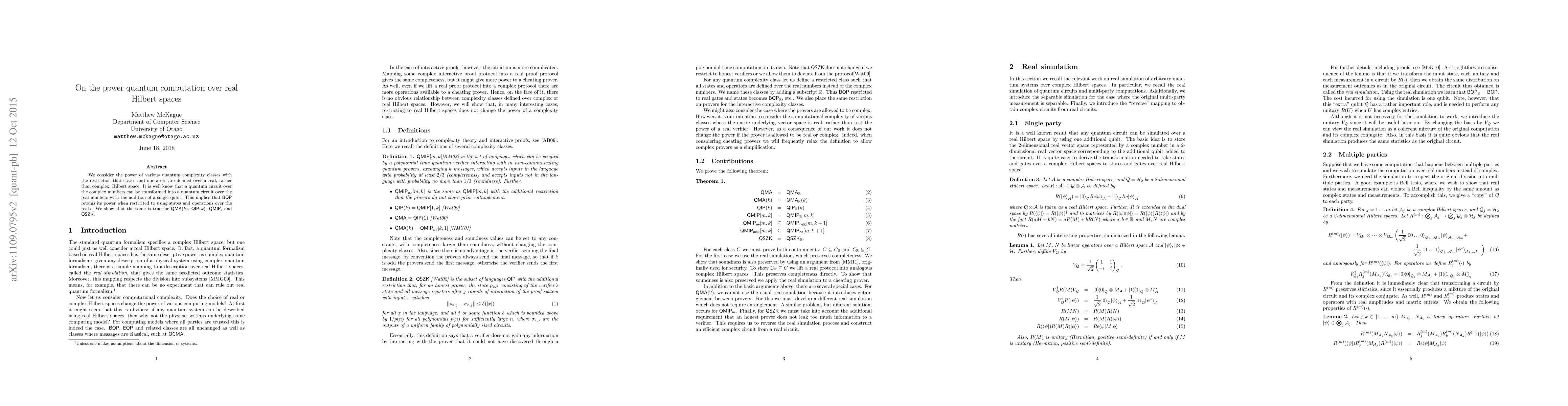 Researchers show that quantum complexity classes like BQP, QMA(k), QIP(k), QMIP, and QSZK retain their power when restricted to using states and operations over real Hilbert spaces, implying a potential simplification of complex quantum algorithms.