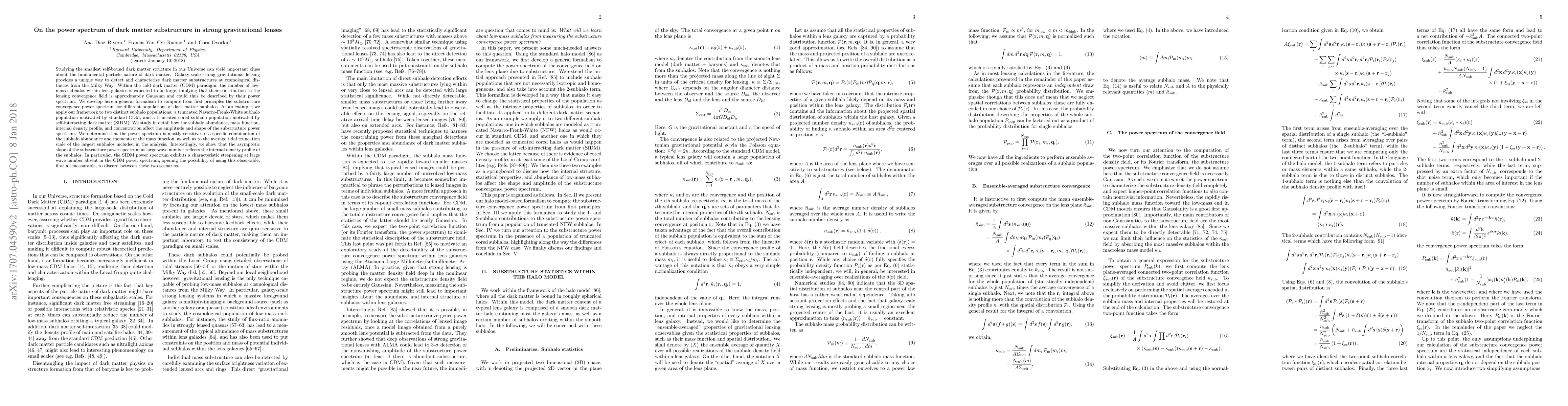 Studying the smallest self-bound dark matter structure in our Universe can yield important clues about the fundamental particle nature of dark matter. Galaxy-scale strong gravitational lensing provides a unique way to detect and characterize dark matter substructures at cosmological distances from the Milky Way. Within the cold dark matter (CDM) paradigm, the number of low-mass subhalos within lens galaxies is expected to be large, implying that their contribution to the lensing convergence field is approximately Gaussian and could thus be described by their power spectrum. We develop here a general formalism to compute from first principles the substructure convergence power spectrum for different populations of dark matter subhalos. As an example, we apply our framework to two distinct subhalo populations: a truncated Navarro-Frenk-White subhalo population motivated by standard CDM, and a truncated cored subhalo population motivated by self-interacting dark matter (SIDM). We study in detail how the subhalo abundance, mass function, internal density profile, and concentration affect the amplitude and shape of the substructure power spectrum. We determine that the power spectrum is mostly sensitive to a specific combination of the subhalo abundance and moments of the mass function, as well as to the average tidal truncation scale of the largest subhalos included in the analysis. Interestingly, we show that the asymptotic slope of the substructure power spectrum at large wave number reflects the internal density profile of the subhalos. In particular, the SIDM power spectrum exhibits a characteristic steepening at large wave number absent in the CDM power spectrum, opening the possibility of using this observable, if at all measurable, to discern between these two scenarios.
