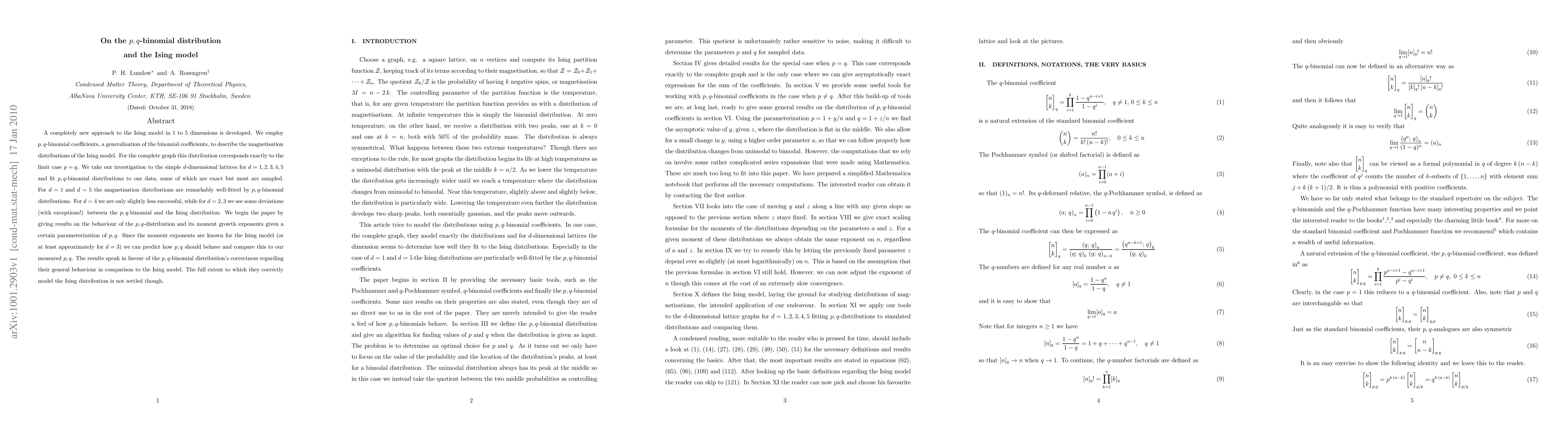 A completely new approach to the Ising model in 1 to 5 dimensions is developed. We employ $p,q$-binomial coefficients, a generalisation of the binomial coefficients, to describe the magnetisation distributions of the Ising model. For the complete graph this distribution corresponds exactly to the limit case $p=q$. We take our investigation to the simple $d$-dimensional lattices for $d=1,2,3,4,5$ and fit $p,q$-binomial distributions to our data, some of which are exact but most are sampled. For $d=1$ and $d=5$ the magnetisation distributions are remarkably well-fitted by $p,q$-binomial distributions. For $d=4$ we are only slightly less successful, while for $d=2,3$ we see some deviations (with exceptions!) between the $p,q$-binomial and the Ising distribution. We begin the paper by giving results on the behaviour of the $p,q$-distribution and its moment growth exponents given a certain parameterization of $p,q$. Since the moment exponents are known for the Ising model (or at least approximately for $d=3$) we can predict how $p,q$ should behave and compare this to our measured $p,q$. The results speak in favour of the $p,q$-binomial distribution's correctness regarding their general behaviour in comparison to the Ising model. The full extent to which they correctly model the Ising distribution is not settled though.