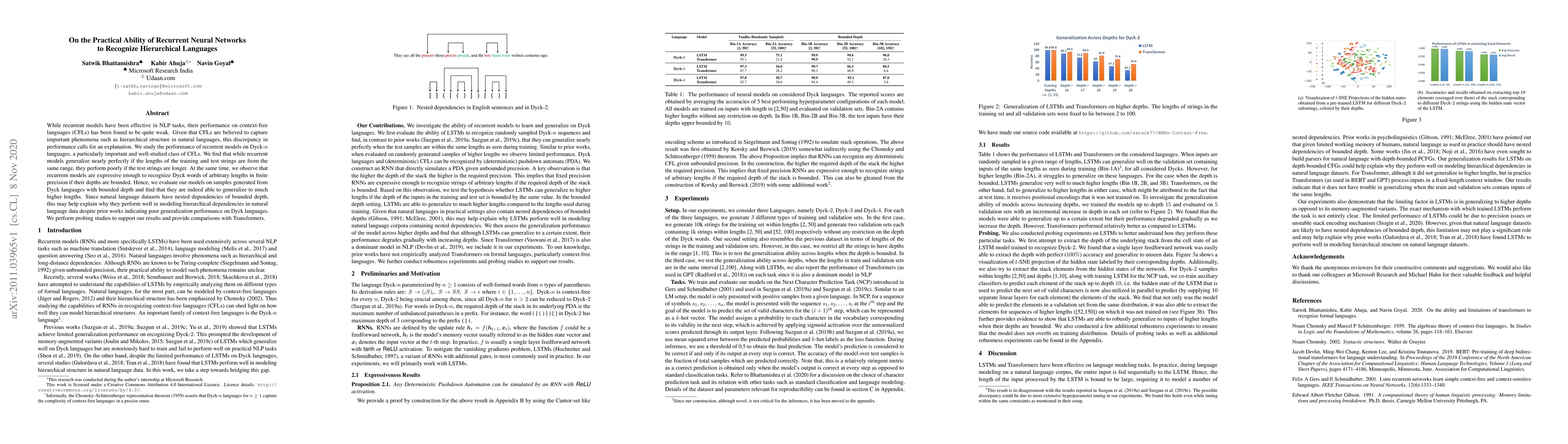 This paper investigates the ability of recurrent neural networks to recognize hierarchical structures in context-free languages, finding that while they generalize well within the same length range, they struggle with longer test strings. The study concludes that bounded depth in natural language dependencies may explain their effective performance in modeling hierarchical structures despite poor generalization on Dyck languages.