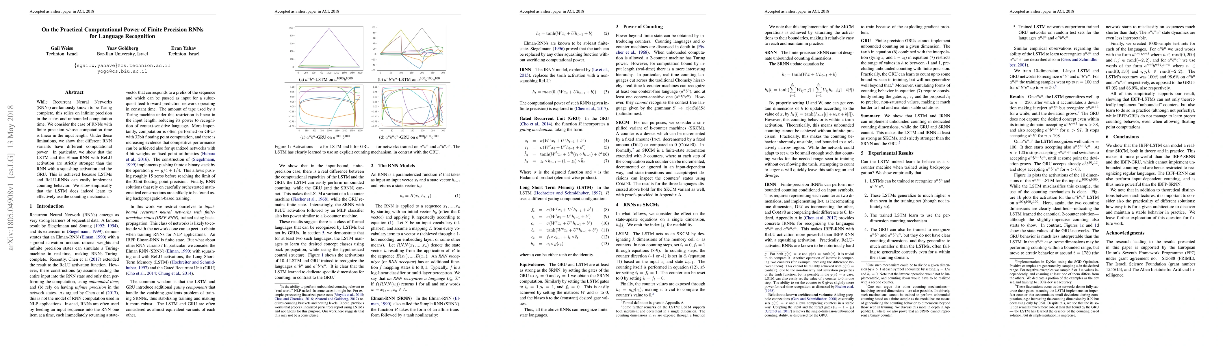 While Recurrent Neural Networks (RNNs) are famously known to be Turing complete, this relies on infinite precision in the states and unbounded computation time. We consider the case of RNNs with finite precision whose computation time is linear in the input length. Under these limitations, we show that different RNN variants have different computational power. In particular, we show that the LSTM and the Elman-RNN with ReLU activation are strictly stronger than the RNN with a squashing activation and the GRU. This is achieved because LSTMs and ReLU-RNNs can easily implement counting behavior. We show empirically that the LSTM does indeed learn to effectively use the counting mechanism.