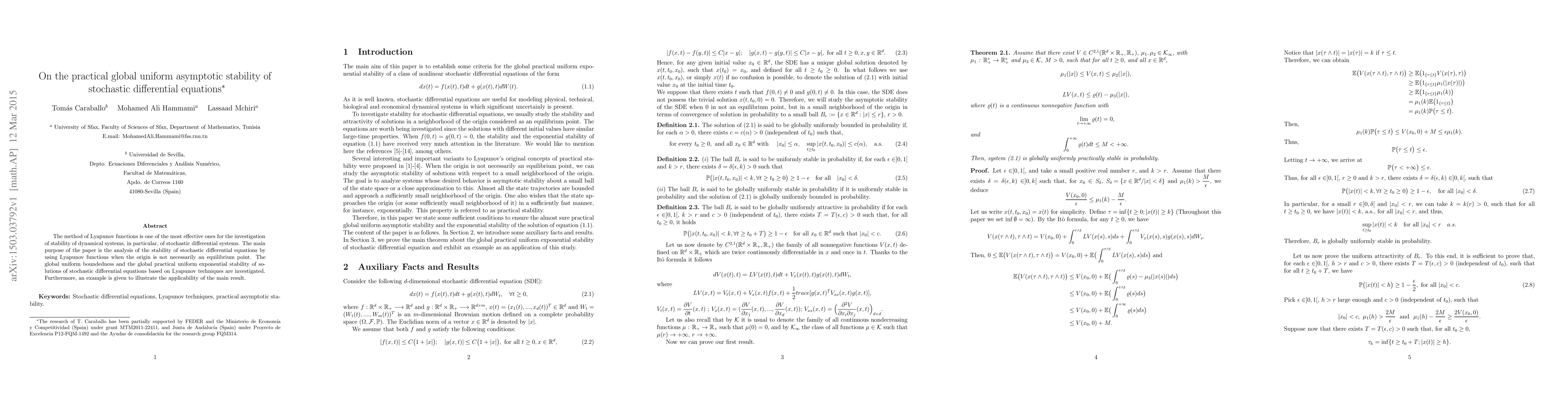 This paper investigates the stability of stochastic differential equations using Lyapunov functions, focusing on global uniform asymptotic stability when the origin is not an equilibrium point. It explores global uniform boundedness and practical uniform exponential stability, supported by an example demonstrating the method's effectiveness.
