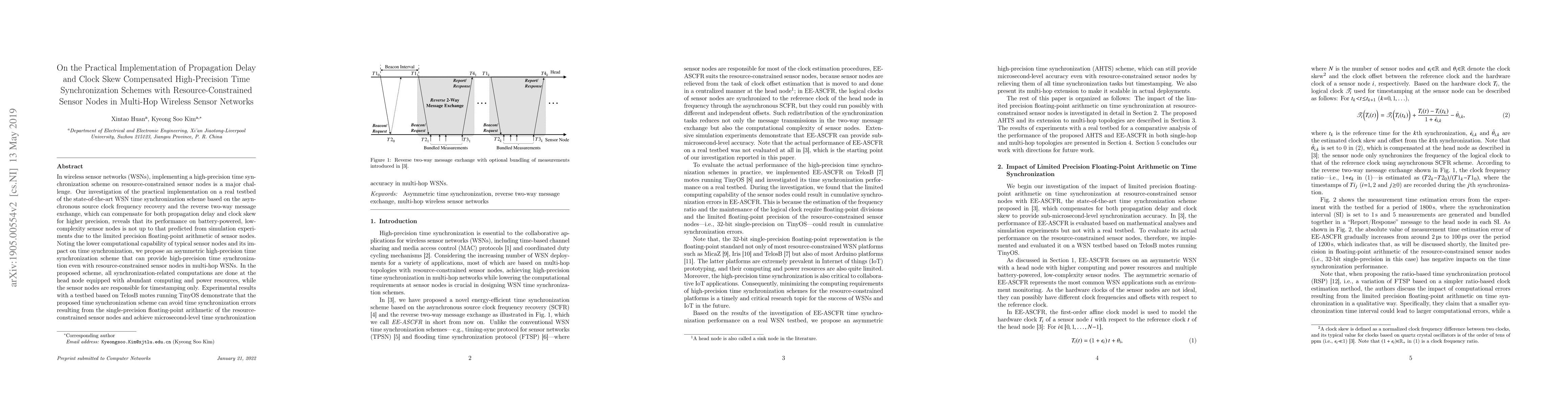This paper investigates high-precision time synchronization schemes for resource-constrained sensor nodes in multi-hop wireless sensor networks, finding limitations in existing methods due to limited precision arithmetic. It proposes an asymmetric scheme where only the head node performs synchronization computations, achieving microsecond-level accuracy with practical testbed experiments.