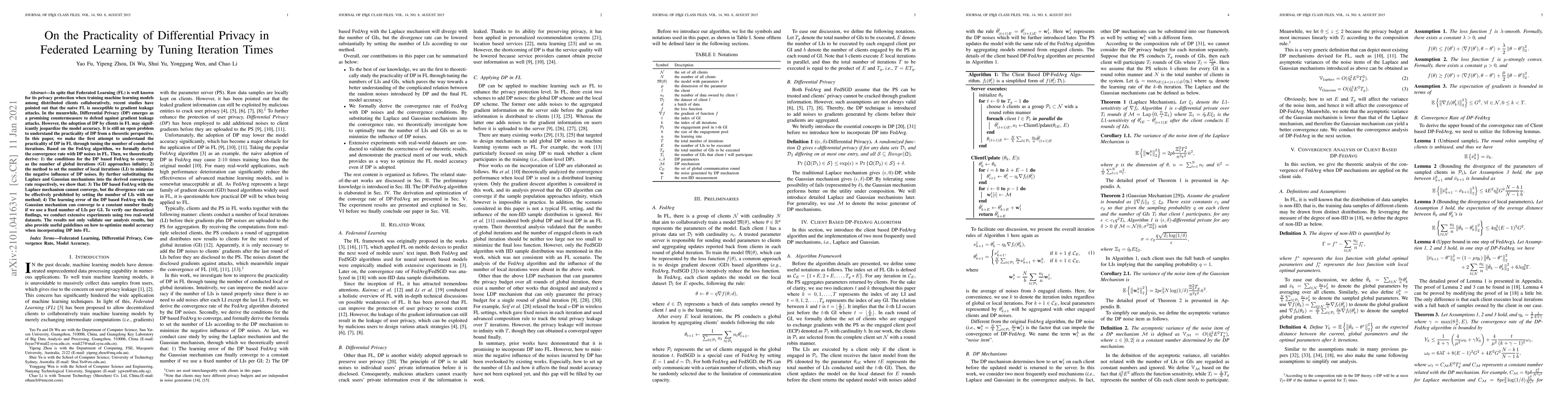 This paper explores the practicality of Differential Privacy (DP) in Federated Learning (FL) by tuning the number of iterations. It derives theoretical conditions for DP-based FedAvg convergence and proposes methods to minimize DP's negative impact on model accuracy, demonstrating that while DP with the Laplace mechanism cannot converge, the Gaussian mechanism can, given optimal local iteration settings. Experiments validate these findings and offer practical guidelines for integrating DP into FL.