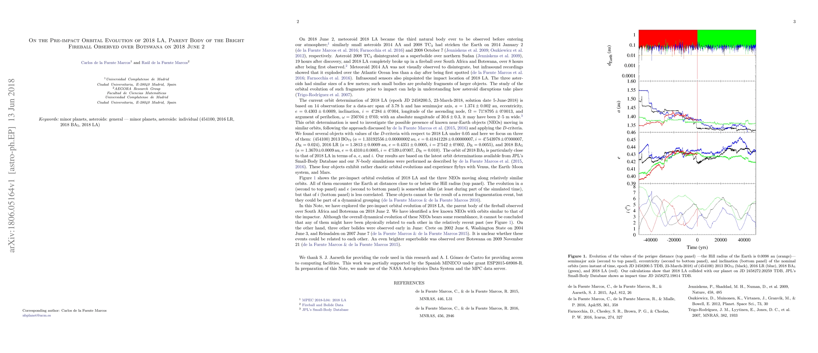 On 2018 June 2, meteoroid 2018 LA became the third natural body ever to be observed before entering our atmosphere ---small asteroids 2014 AA and 2008 TC3 had stricken the Earth on 2014 January 2 and 2008 October 7, respectively. Here, we explore the pre-impact orbital evolution of 2018 LA and investigate the possible presence of known NEOs moving in similar orbits using N-body simulations and the D-criteria. We identify several objects moving in orbits similar to that of 2018 LA and focus on three of them: (454100) 2013 BO73, which is the largest of the group and a PHA, 2016 LR, and 2018 BA5, which follows a path very close to that of 2018 LA in terms of semimajor axis, eccentricity, and inclination. All these objects could be part of a dynamical grouping and their orbital evolution is rather chaotic, experiencing close encounters with Venus, the Earth-Moon system, and Mars. NEO encounters take place at the node and, on the short-term, the relative positions of our planet in its orbit around the Sun repeat every year. Besides the bright fireball observed over Botswana on 2018 June 2, three other bolides were observed early in June in recent years: Crete on 2002 June 6, Washington State on 2004 June 3, and Reisadalen on 2007 June 7.
