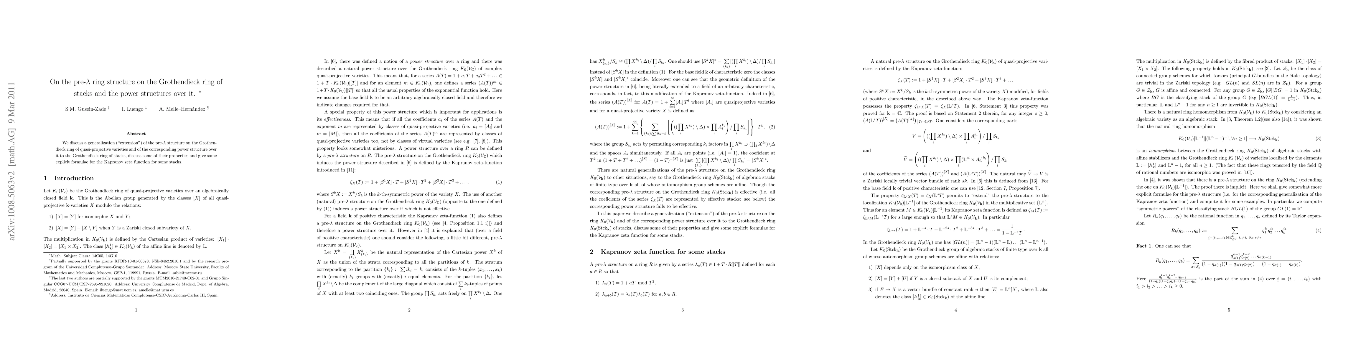In this note we discuss a generalization ("extension") of the pre-lambda structure on the Grothendieck ring of quasi-projective varieties and of the corresponding power structure over it to the Grothendieck ring of stacks, discuss some of their properties and give some explicit formulae for the Kapranov zeta function for some stacks.