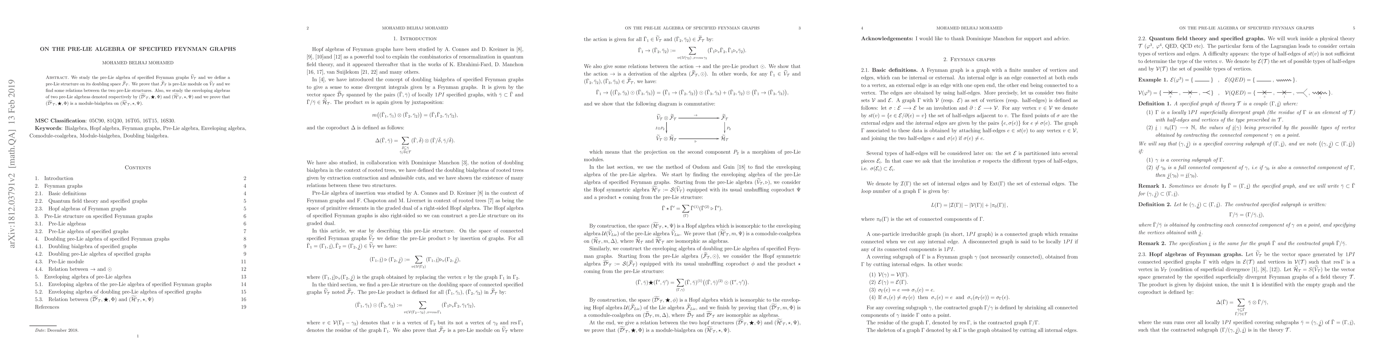 We study the pre-Lie algebra of specified Feynman graphs $\wt{V}_{\Cal T}$ and we define a pre-Lie structure on its doubling space $\wt{\Cal F}_{\Cal T}$. We prove that $\wt{\Cal F}_{\Cal T}$ is pre-Lie module on $\wt{V}_{\Cal T}$ and we find some relations between the two pre-Lie structures. Also, we study the enveloping algebras of two pre-Lie algebras denoted respectively by $(\wt {\Cal D'}_{\Cal T}, \bigstar, \Phi)$ and $(\wt {\Cal H'}_{\Cal T}, \star, \Psi)$ and we prove that $(\wt {\Cal D'}_{\Cal T}, \bigstar, \Phi)$ is a module-bialgebra on $(\wt {\Cal H'}_{\Cal T}, \star, \Psi)$.