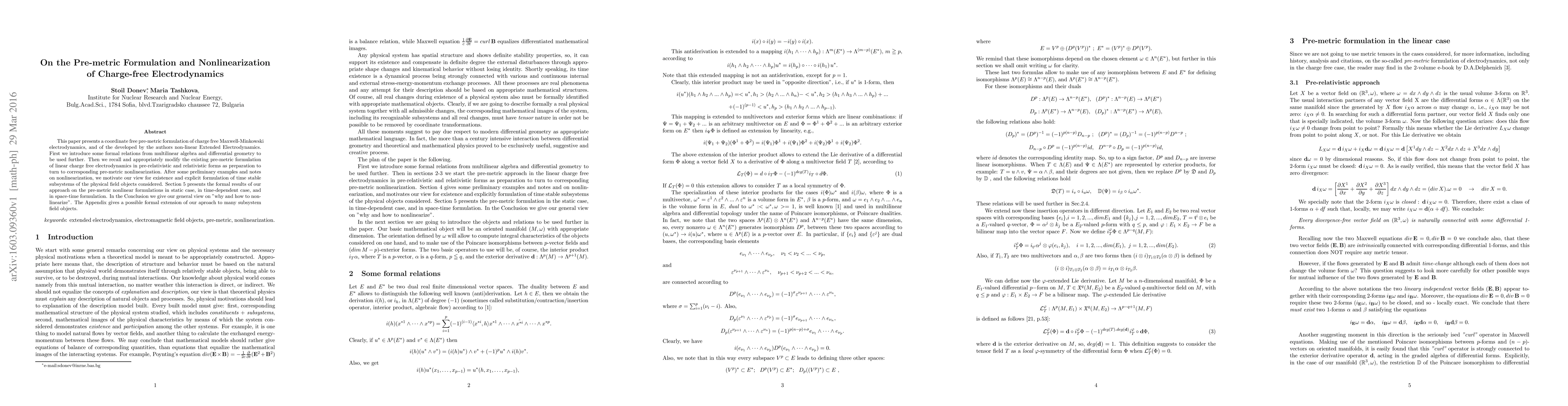 This paper presents a coordinate-free pre-metric formulation of charge-free electrodynamics and its nonlinear extension, utilizing multilinear algebra and differential geometry. It presents pre-metric nonlinear formulations in static, time-dependent, and space-time contexts, and discusses the motivation and methodology behind the nonlinearization process.