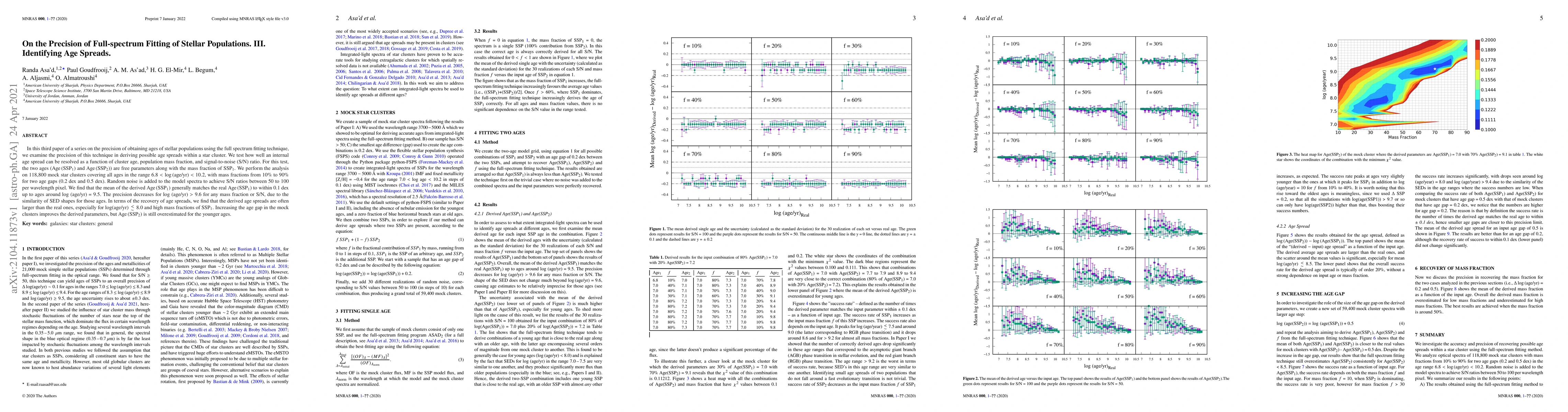 In this third paper of a series on the precision of obtaining ages of stellar populations using the full spectrum fitting technique, we examine the precision of this technique in deriving possible age spreads within a star cluster. We test how well an internal age spread can be resolved as a function of cluster age, population mass fraction, and signal-to-noise (S/N) ratio. For this test, the two ages (Age (SSP1) and Age (SSP2)) are free parameters along with the mass fraction of SSP1. We perform the analysis on 118,800 mock star clusters covering all ages in the range 6.8 < log (age/yr) < 10.2, with mass fractions from 10% to 90% for two age gaps (0.2 dex and 0.5 dex). Random noise is added to the model spectra to achieve S/N ratios between 50 to 100 per wavelength pixel. We find that the mean of the derived Age (SSP1) generally matches the real Age (SSP1) to within 0.1 dex up to ages around log (age/yr) = 9.5. The precision decreases for log (age/yr) > 9.6 for any mass fraction or S/N, due to the similarity of SED shapes for those ages. In terms of the recovery of age spreads, we find that the derived age spreads are often larger than the real ones, especially for log(age/yr) < 8.0 and high mass fractions of SSP1. Increasing the age gap in the mock clusters improves the derived parameters, but Age (SSP2) is still overestimated for the younger ages.