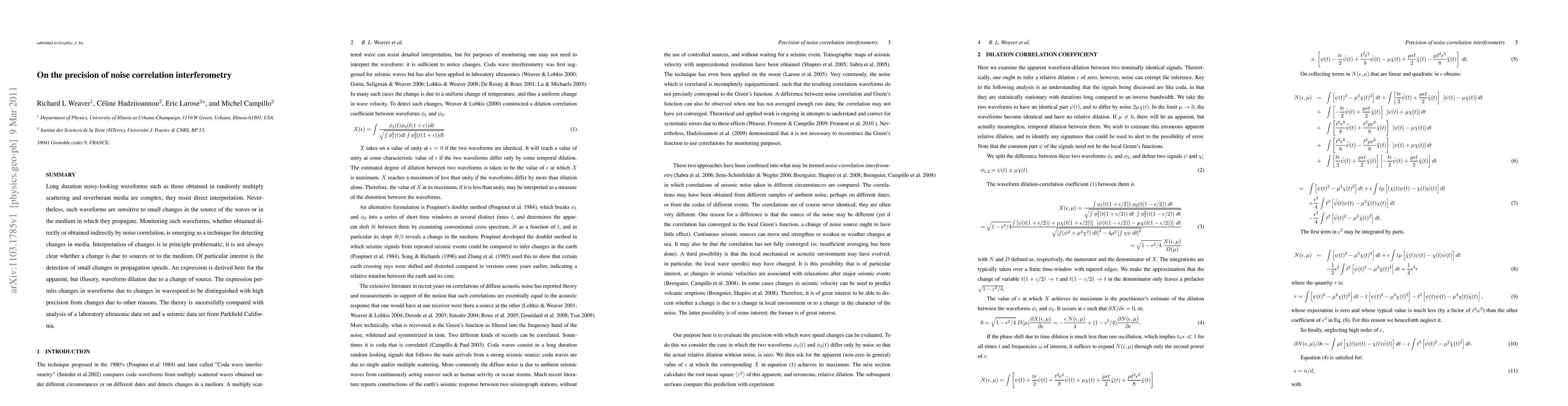 Long duration noisy-looking waveforms such as those obtained in randomly multiply scattering and reverberant media are complex; they resist direct interpretation. Nevertheless, such waveforms are sensitive to small changes in the source of the waves or in the medium in which they propagate. Monitoring such waveforms, whether obtained directly or obtained indirectly by noise correlation, is emerging as a technique for detecting changes in media. Interpretation of changes is in principle problematic; it is not always clear whether a change is due to sources or to the medium. Of particular interest is the detection of small changes in propagation speeds. An expression is derived here for the apparent, but illusory, waveform dilation due to a change of source. The expression permits changes in waveforms due to changes in wavespeed to be distinguished with high precision from changes due to other reasons. The theory is successfully compared with analysis of a laboratory ultrasonic data set and a seismic data set from Parkfield California.